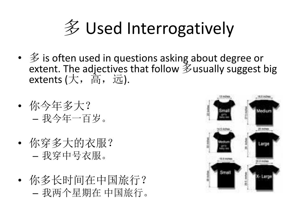 多 Used Interrogatively • 多 is often used in questions asking about degree or extent. The adjectives that follow 多usually suggest big extents (大,高,远). • 你今年多大? • 我今年一百岁。 • 你穿多大的衣服? • 我穿中号衣服。 • 你多长时间在中国旅行? • 我两个星期在 中国旅行。