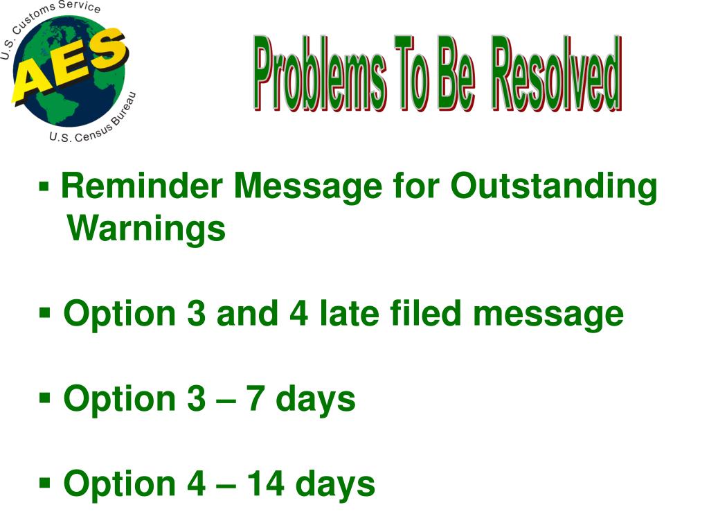 Problems To Be Resolved • Reminder Message for Outstanding Warnings • Option 3 and 4 late filed message • Option 3 – 7 days • Option 4 – 14 days