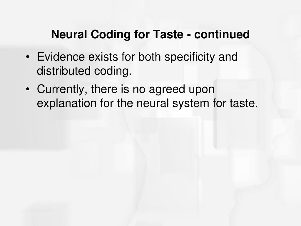 Neural Coding for Taste - continued • Evidence exists for both specificity and distributed coding. • Currently, there is no agreed upon explanation for the neural system for taste.