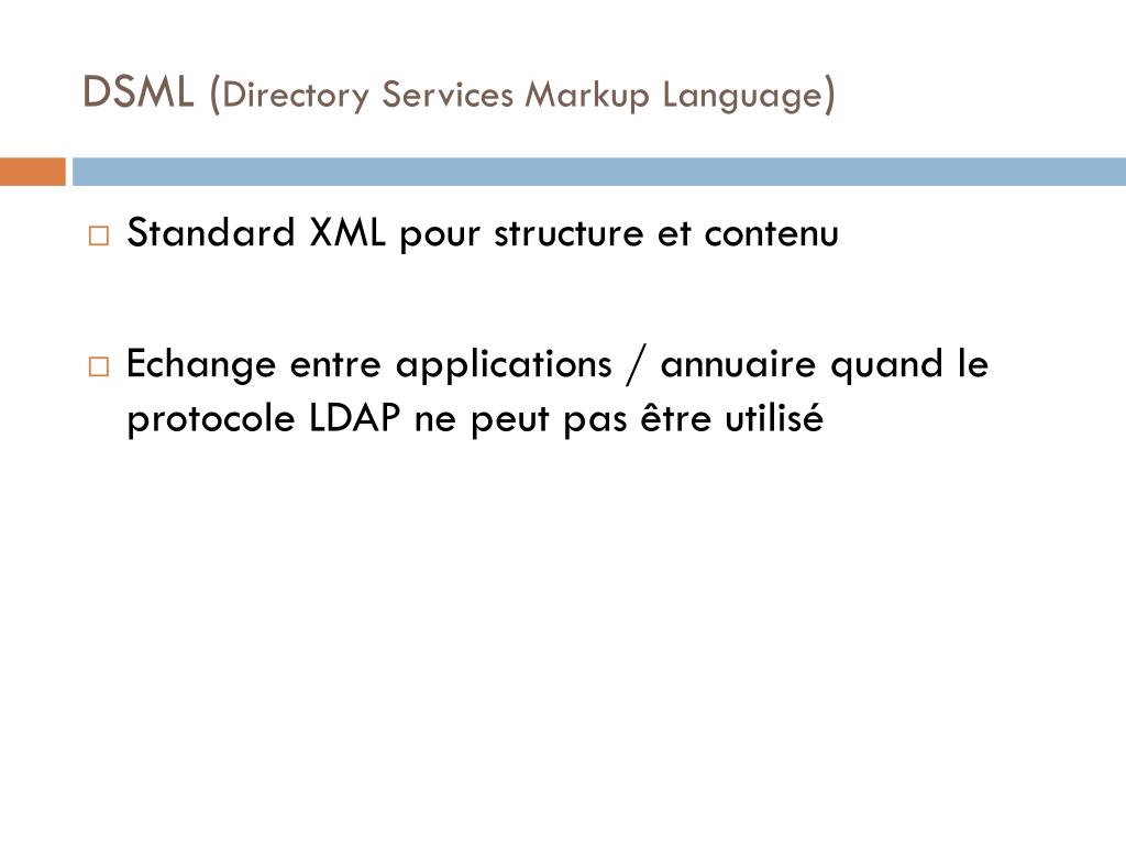 DSML (Directory Services Markup Language) • Standard XML pour structure et contenu • Echange entre applications / annuaire quand le protocole LDAP ne peut pas être utilisé