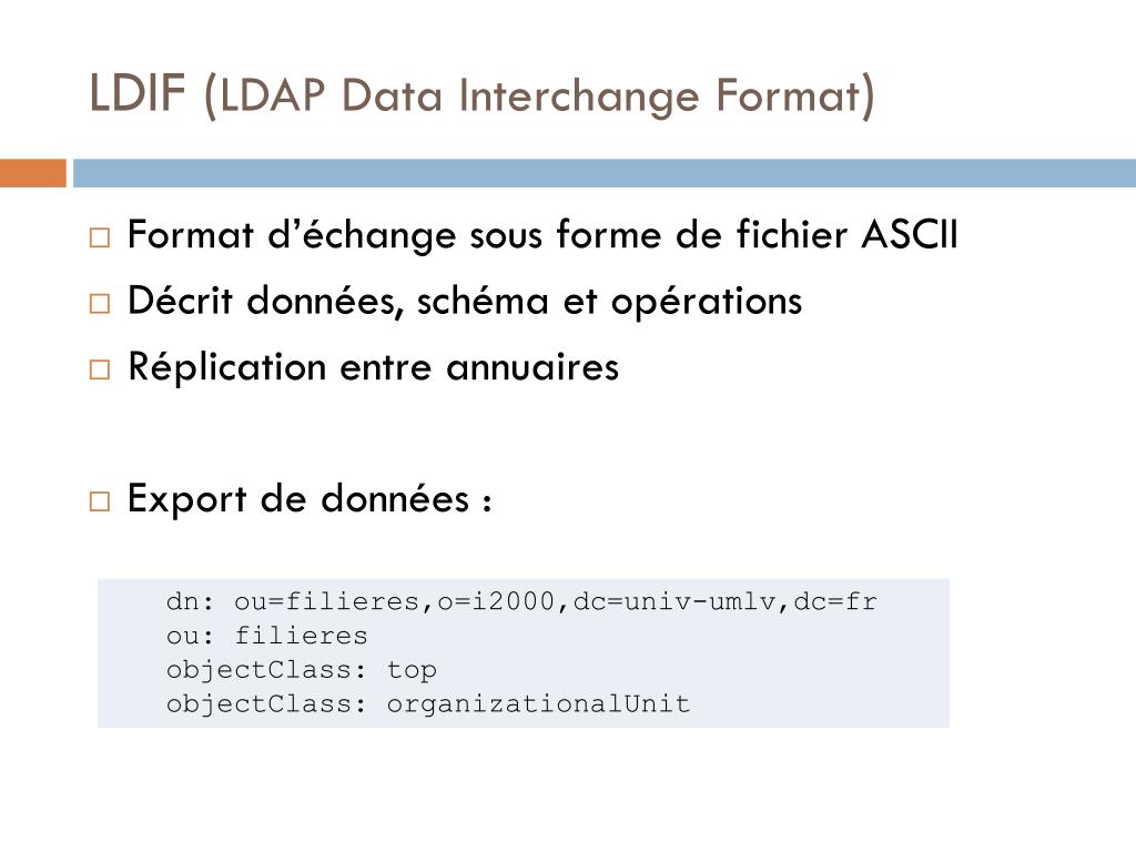 LDIF (LDAP Data Interchange Format) • Format d’échange sous forme de fichier ASCII • Décrit données, schéma et opérations • Réplication entre annuaires • Export de données : dn: ou=filieres,o=i2000,dc=univ-umlv,dc=fr ou: filieres objectClass: top objectClass: organizationalUnit