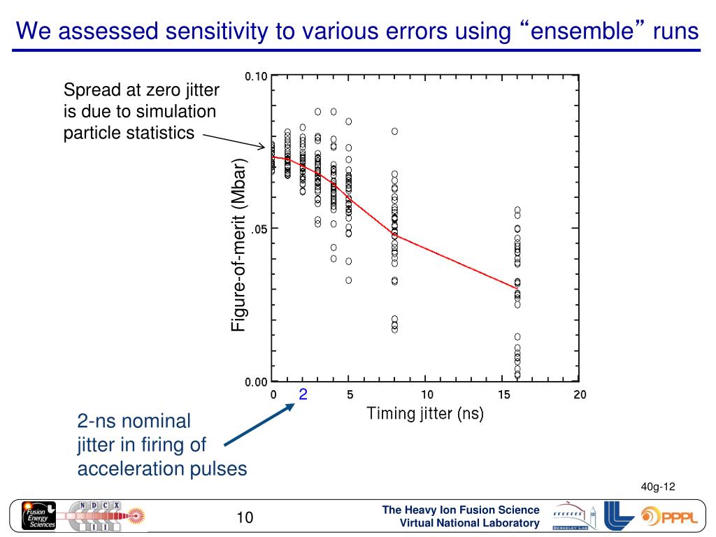 We assessed sensitivity to various errors using “ensemble” runs Spread at zero jitter is due to simulation particle statistics Figure-of-merit (Mbar) 2 2-ns nominal jitter in firing of acceleration pulses 40g-12