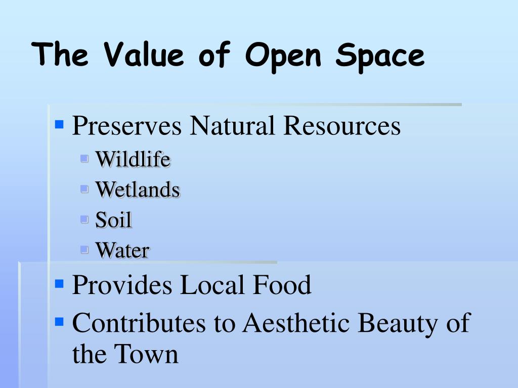 The Value of Open Space • Preserves Natural Resources • Wildlife • Wetlands • Soil • Water • Provides Local Food • Contributes to Aesthetic Beauty of the Town