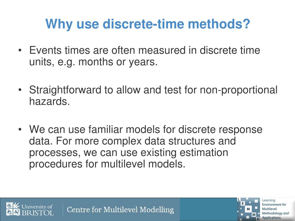 Why use discrete-time methods? • Events times are often measured in discrete time units, e.g. months or years. • Straightforward to allow and test for non-proportional hazards. • We can use familiar models for discrete response data. For more complex data structures and processes, we can use existing estimation procedures for multilevel models.