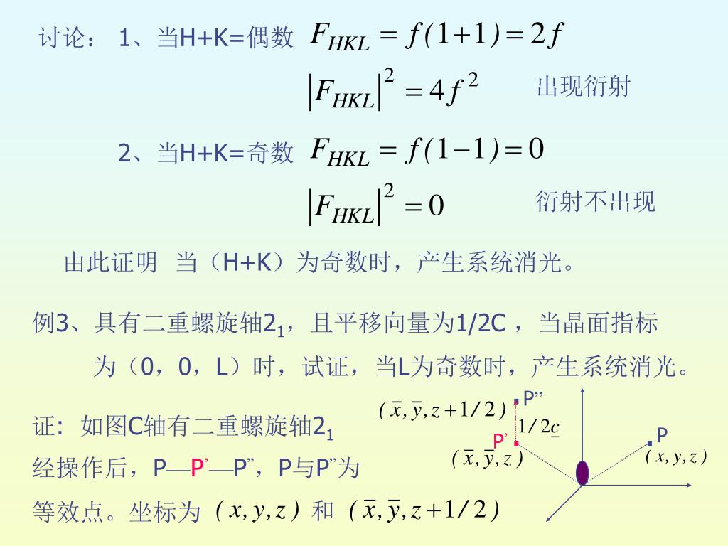 讨论: 1、当H+K=偶数 出现衍射 2、当H+K=奇数 衍射不出现 由此证明 当(H+K)为奇数时,产生系统消光。 例3、具有二重螺旋轴21,且平移向量为1/2C ,当晶面指标 为(0,0,L)时,试证,当L为奇数时,产生系统消光。 . P” 证: 如图C轴有二重螺旋轴21 . . P P’ 经操作后,P—P’—P”,P与P”为 等效点。坐标为 和
