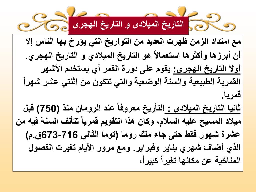 التقويم القمرى والتاريخ الهجرى. إعداد جنات عبد العزيز دنيا. تعريف التقويم : التقويم مقياس الزمن كالساعة فكما أن الساعة مقياس تعرف به ساعات الليل والنهار كذلك التقويم مقياس تعرف به الأيام والأسابيع والشهور، فإنه يذكرنا باليوم الذي نحن فيه
