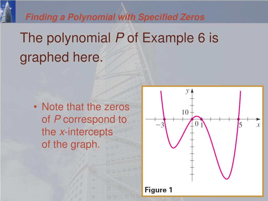 Finding a Polynomial with Specified Zeros • The polynomial P of Example 6 is graphed here. • Note that the zeros of P correspond to the x-intercepts of the graph.