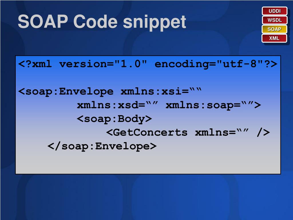UDDI SOAP Code snippet WSDL SOAP XML <?xml version="1.0" encoding="utf-8"?> <soap:Envelope xmlns:xsi=““ xmlns:xsd=“” xmlns:soap=“”> <soap:Body> <GetConcerts xmlns=“” /> </soap:Body> </soap:Envelope>