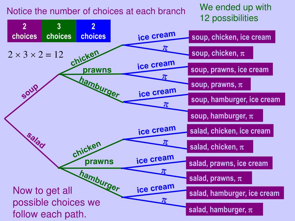 We ended up with 12 possibilities ice cream chicken ice cream prawns hamburger soup ice cream ice cream salad chicken ice cream prawns hamburger ice cream Notice the number of choices at each branch 2choices 3choices 2choices soup, chicken, ice cream soup, chicken, 2 3 2 = 12 soup, prawns, ice cream soup, prawns, soup, hamburger, ice cream soup, hamburger, salad, chicken, ice cream salad, chicken, salad, prawns, ice cream salad, prawns, Now to get all possible choices we follow each path. salad, hamburger, ice cream salad, hamburger,