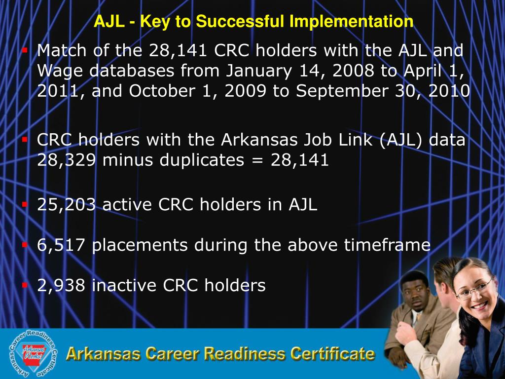 AJL - Key to Successful Implementation • Match of the 28,141 CRC holders with the AJL and Wage databases from January 14, 2008 to April 1, 2011, and October 1, 2009 to September 30, 2010 • CRC holders with the Arkansas Job Link (AJL) data 28,329 minus duplicates = 28,141 • 25,203 active CRC holders in AJL • 6,517 placements during the above timeframe • 2,938 inactive CRC holders