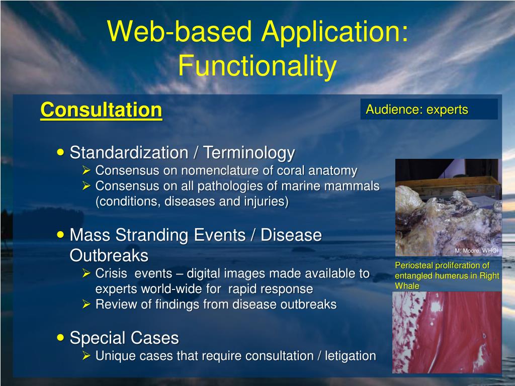 Web-based Application:Functionality • Consultation • Standardization / Terminology • Consensus on nomenclature of coral anatomy • Consensus on all pathologies of marine mammals (conditions, diseases and injuries) • Mass Stranding Events / Disease Outbreaks • Crisis events – digital images made available to experts world-wide for rapid response • Review of findings from disease outbreaks • Special Cases • Unique cases that require consultation / letigation Audience: experts M. Moore, WHOI Periostealproliferation of entangled humerus in Right Whale