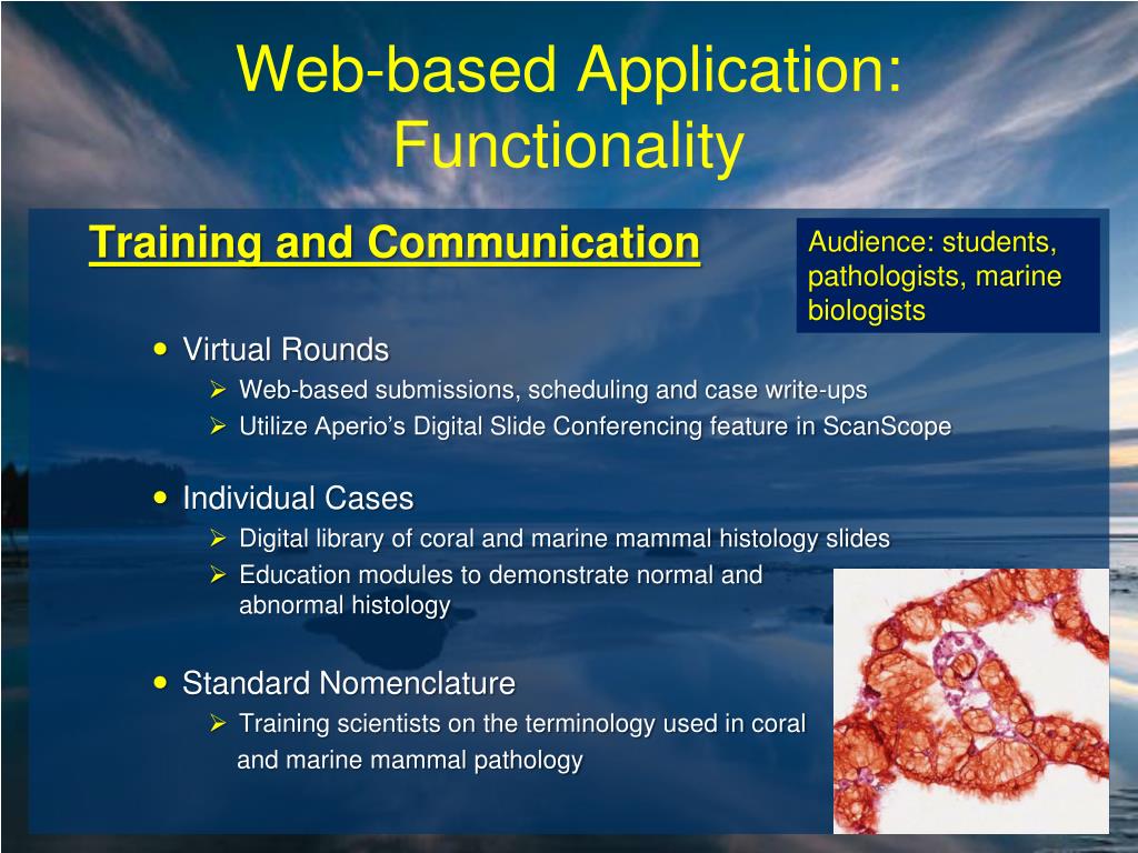 Web-based Application:Functionality Training and Communication • Virtual Rounds • Web-based submissions, scheduling and case write-ups • Utilize Aperio’s Digital Slide Conferencing feature in ScanScope • Individual Cases • Digital library of coral and marine mammal histology slides • Education modules to demonstrate normal and abnormal histology • Standard Nomenclature • Training scientists on the terminology used in coral and marine mammal pathology Audience: students, pathologists, marine biologists