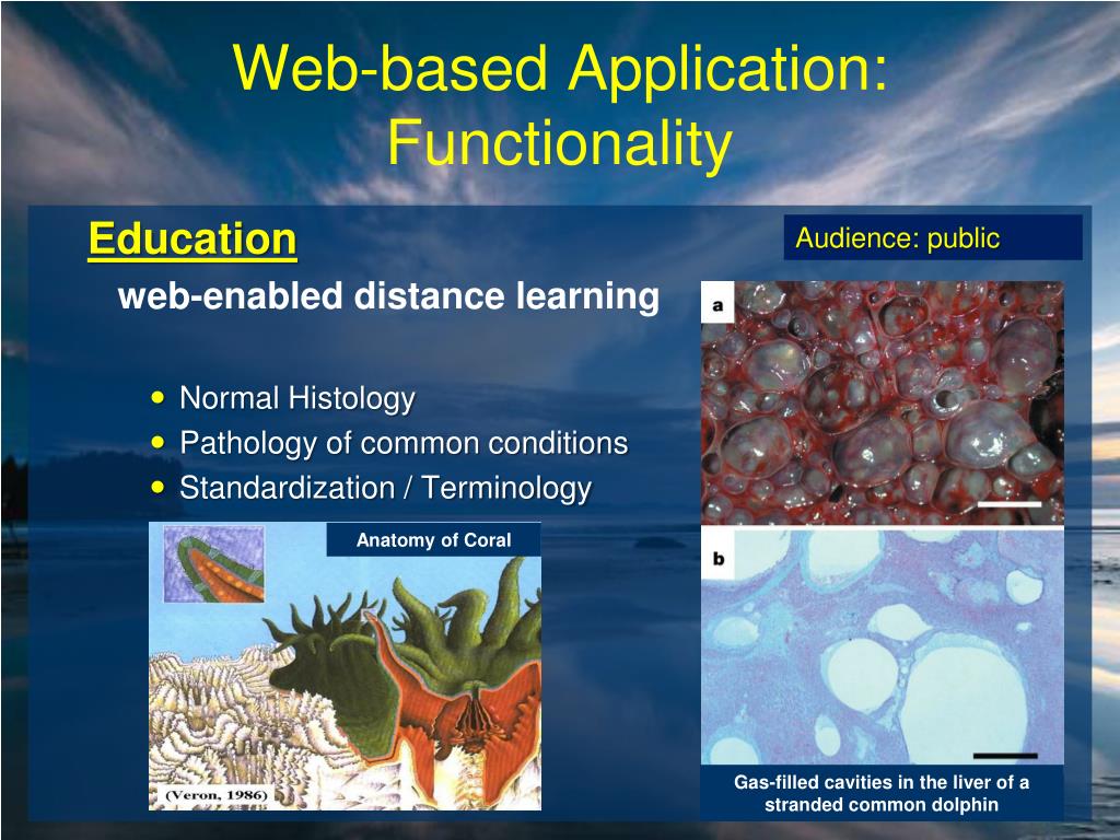 Web-based Application:Functionality Education web-enabled distance learning • Normal Histology • Pathology of common conditions • Standardization / Terminology Audience: public Anatomy of Coral Gas-filled cavities in the liver of a stranded common dolphin