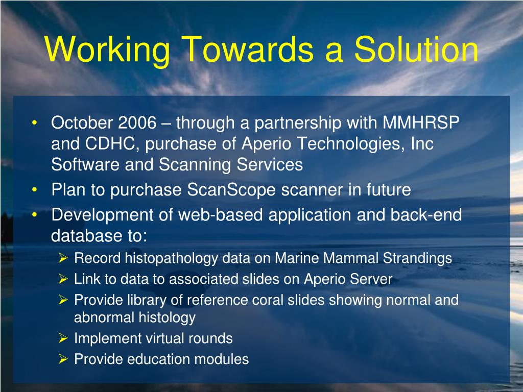 Working Towards a Solution • October 2006 – through a partnership with MMHRSP and CDHC, purchase of Aperio Technologies, Inc Software and Scanning Services • Plan to purchase ScanScope scanner in future • Development of web-based application and back-end database to: • Record histopathology data on Marine Mammal Strandings • Link to data to associated slides on Aperio Server • Provide library of reference coral slides showing normal and abnormal histology • Implement virtual rounds • Provide education modules