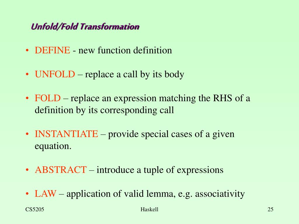 Unfold/Fold Transformation • DEFINE - new function definition • UNFOLD – replace a call by its body • FOLD – replace an expression matching the RHS of a definition by its corresponding call • INSTANTIATE – provide special cases of a given equation. • ABSTRACT – introduce a tuple of expressions • LAW – application of valid lemma, e.g. associativity Haskell