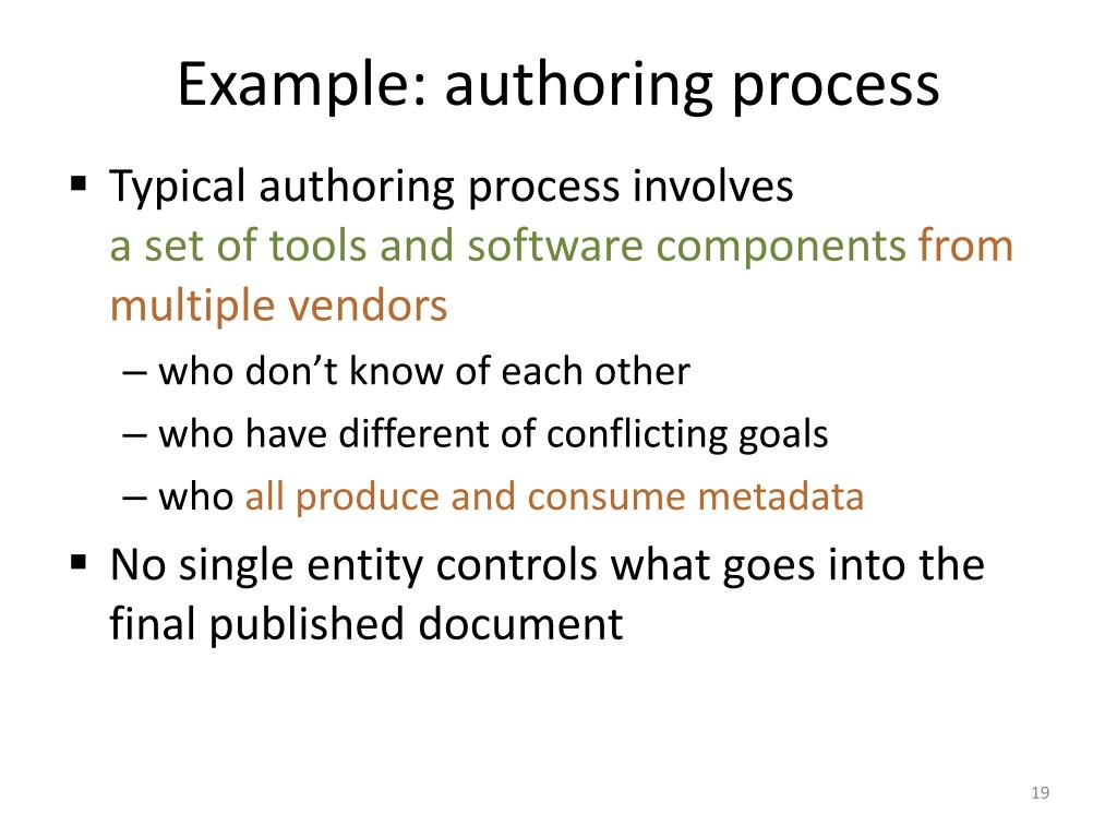 Example: authoring process • Typical authoring process involves a set of tools and software components from multiple vendors • who don’t know of each other • who have different of conflicting goals • who all produce and consume metadata • No single entity controls what goes into the final published document