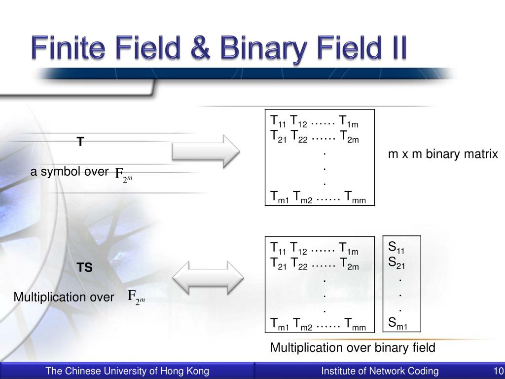 Finite Field & Binary Field II T m x m binary matrix a symbol over TS Multiplication over Multiplication over binary field The Chinese University of Hong Kong