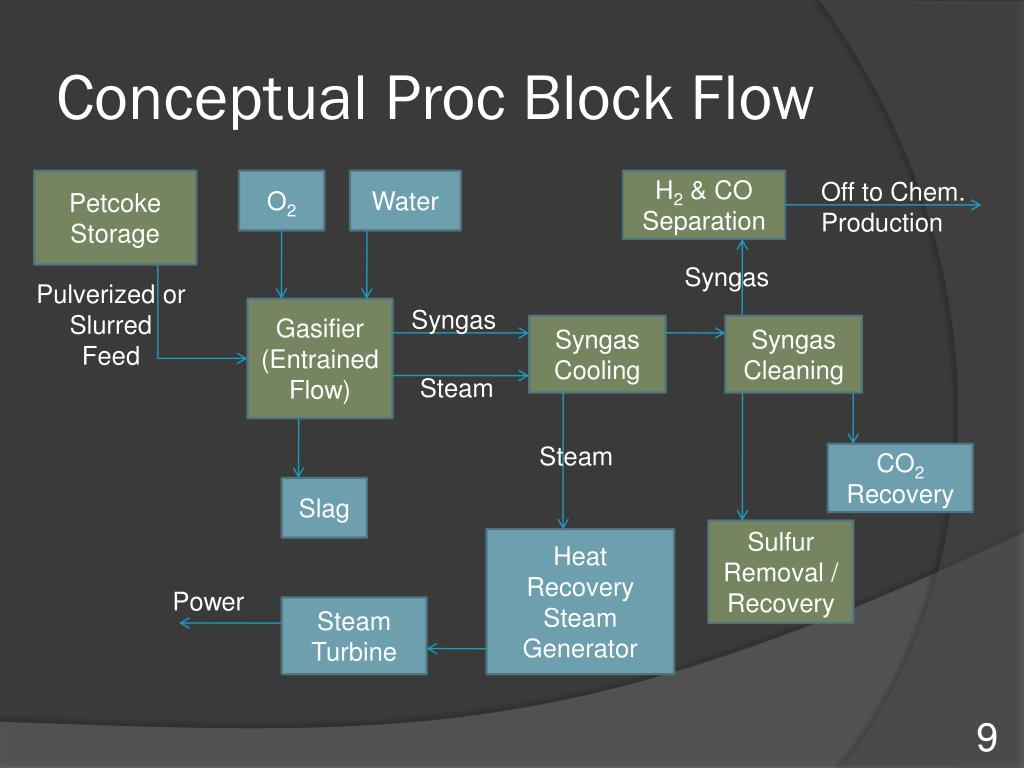 Conceptual Proc Block Flow Petcoke Storage O2 Water H2 & CO Separation Off to Chem. Production Syngas Pulverized or Slurred Feed Gasifier (Entrained Flow) Syngas Syngas Cooling Syngas Cleaning Steam Steam CO2 Recovery Slag Sulfur Removal / Recovery Heat Recovery Steam Generator Power Steam Turbine