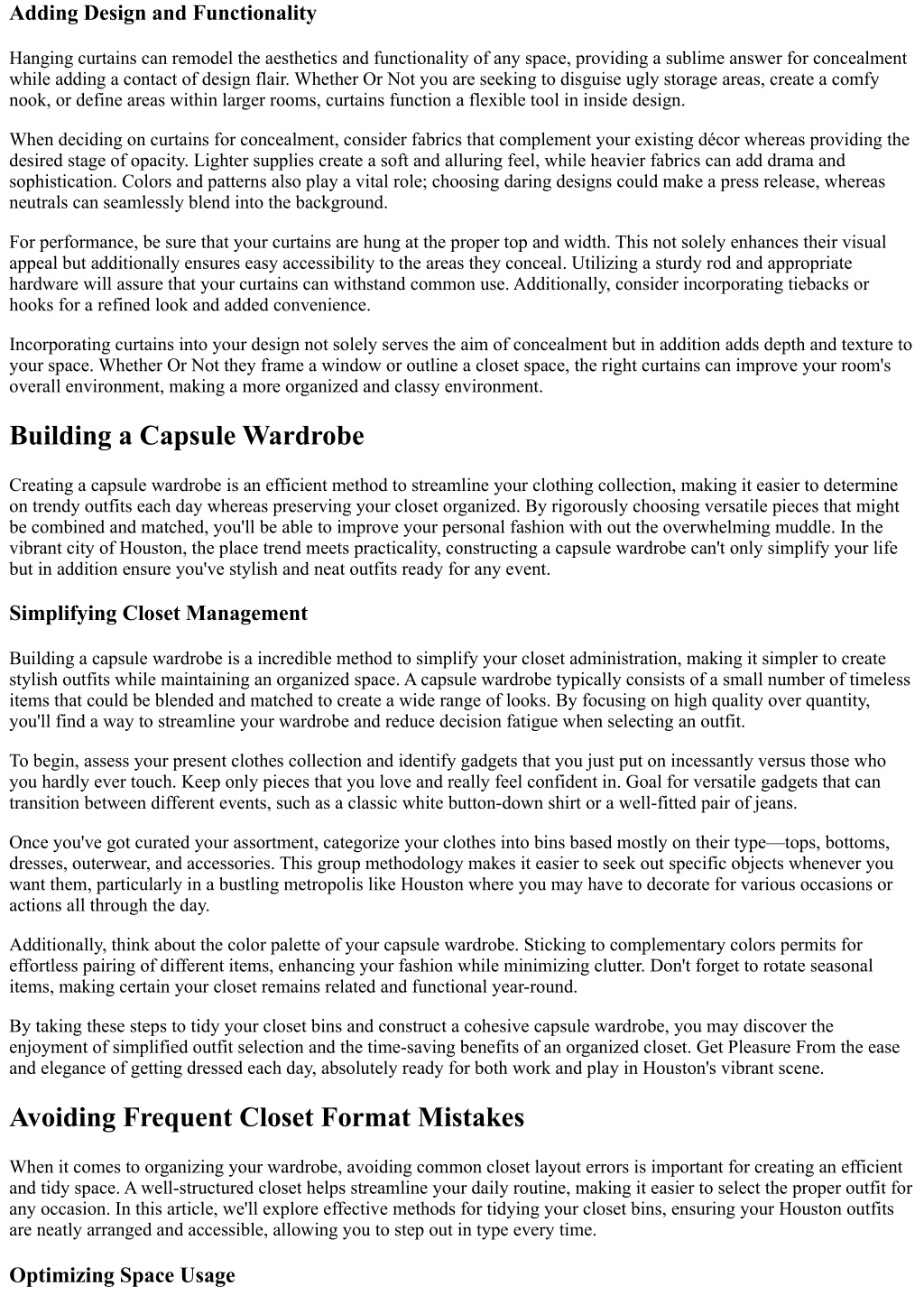 Adding Design and Functionality Hanging curtains can remodel the aesthetics and functionality of any space, providing a sublime answer for concealment while adding a contact of design flair. Whether Or Not you are seeking to disguise ugly storage areas, create a comfy nook, or define areas within larger rooms, curtains function a flexible tool in inside design. When deciding on curtains for concealment, consider fabrics that complement your existing décor whereas providing the desired stage of opacity. Lighter supplies create a soft and alluring feel, while heavier fabrics can add drama and sophistication. Colors and patterns also play a vital role; choosing daring designs could make a press release, whereas neutrals can seamlessly blend into the background. For performance, be sure that your curtains are hung at the proper top and width. This not solely enhances their visual appeal but additionally ensures easy accessibility to the areas they conceal. Utilizing a sturdy rod and appropriate hardware will assure that your curtains can withstand common use. Additionally, consider incorporating tiebacks or hooks for a refined look and added convenience. Incorporating curtains into your design not solely serves the aim of concealment but in addition adds depth and texture to your space. Whether Or Not they frame a window or outline a closet space, the right curtains can improve your room's overall environment, making a more organized and classy environment. Building a Capsule Wardrobe Creating a capsule wardrobe is an efficient method to streamline your clothing collection, making it easier to determine on trendy outfits each day whereas preserving your closet organized. By rigorously choosing versatile pieces that might be combined and matched, you'll be able to improve your personal fashion with out the overwhelming muddle. In the vibrant city of Houston, the place trend meets practicality, constructing a capsule wardrobe can't only simplify your life but in addition ensure you've stylish and neat outfits ready for any event. Simplifying Closet Management Building a capsule wardrobe is a incredible method to simplify your closet administration, making it simpler to create stylish outfits while maintaining an organized space. A capsule wardrobe typically consists of a small number of timeless items that could be blended and matched to create a wide range of looks. By focusing on high quality over quantity, you'll find a way to streamline your wardrobe and reduce decision fatigue when selecting an outfit. To begin, assess your present clothes collection and identify gadgets that you just put on incessantly versus those who you hardly ever touch. Keep only pieces that you love and really feel confident in. Goal for versatile gadgets that can transition between different events, such as a classic white button-down shirt or a well-fitted pair of jeans. Once you've got curated your assortment, categorize your clothes into bins based mostly on their type—tops, bottoms, dresses, outerwear, and accessories. This group methodology makes it easier to seek out specific objects whenever you want them, particularly in a bustling metropolis like Houston where you may have to decorate for various occasions or actions all through the day. Additionally, think about the color palette of your capsule wardrobe. Sticking to complementary colors permits for effortless pairing of different items, enhancing your fashion while minimizing clutter. Don't forget to rotate seasonal items, making certain your closet remains related and functional year-round. By taking these steps to tidy your closet bins and construct a cohesive capsule wardrobe, you may discover the enjoyment of simplified outfit selection and the time-saving benefits of an organized closet. Get Pleasure From the ease and elegance of getting dressed each day, absolutely ready for both work and play in Houston's vibrant scene. Avoiding Frequent Closet Format Mistakes When it comes to organizing your wardrobe, avoiding common closet layout errors is important for creating an efficient and tidy space. A well-structured closet helps streamline your daily routine, making it easier to select the proper outfit for any occasion. In this article, we'll explore effective methods for tidying your closet bins, ensuring your Houston outfits are neatly arranged and accessible, allowing you to step out in type every time. Optimizing Space Usage