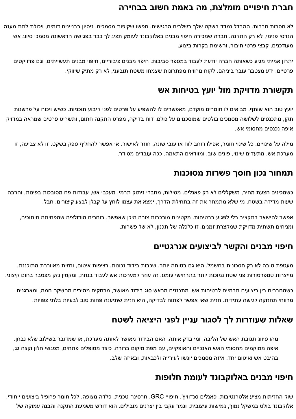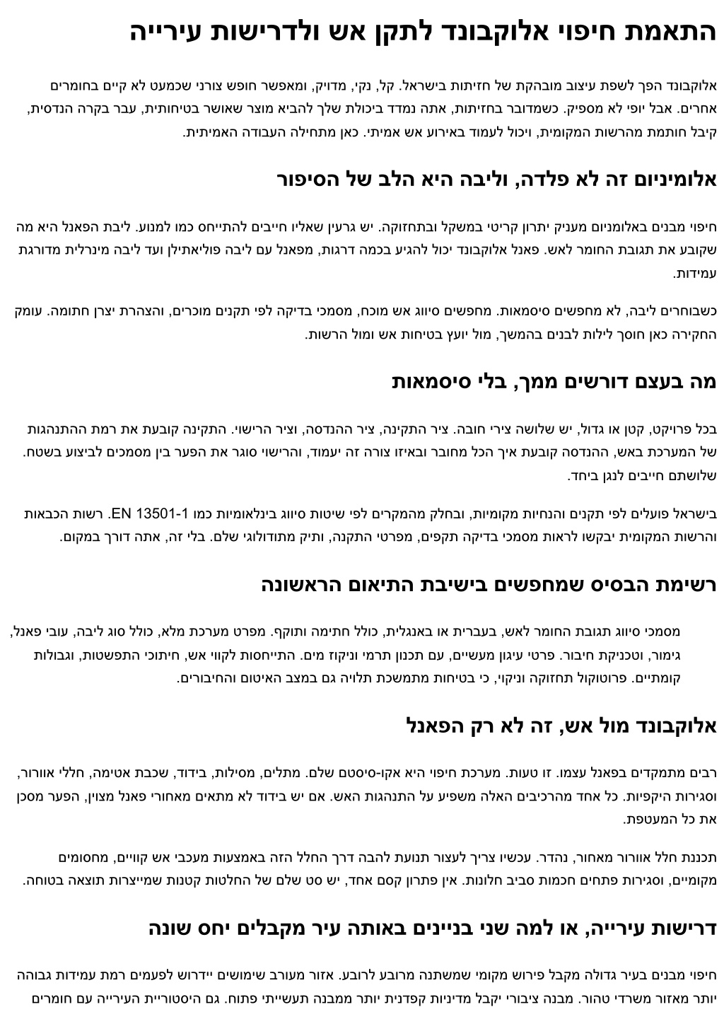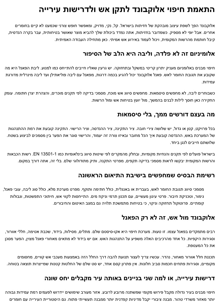 הייריע תושירדלו שא ןקתל דנובקולא יופיח תמאתה םירמוחב םייק אל טעמכש ינרוצ שפוח רשפאמו ,קיודמ ,יקנ ,לק .לארשיב תותיזח לש תקהבומ בוציע תפשל ךפה דנובקולא ,תיסדנה הרקב רבע ,תיתוחיטב רשואש רצומ איבהל ךלש תלוכיב דדמנ התא ,תותיזחב רבודמשכ .קיפסמ אל יפוי לבא .םירחא .תיתימאה הדובעה הליחתמ ןאכ .יתימא שא עוריאב דומעל לוכיו ,תימוקמה תושרהמ תמתוח לביק רופיסה לש בלה איה הבילו ,הדלפ אל הז םוינימולא המ איה לנאפה תביל .עונמל ומכ סחייתהל םיבייח וילאש ןיערג שי .הקוזחתבו לקשמב יטירק ןורתי קינעמ םוינמולאב םינבמ יופיח תגרודמ תילרנימ הביל דעו ןליתאילופ הביל םע לנאפמ ,תוגרד המכב עיגהל לוכי דנובקולא לנאפ .שאל רמוחה תבוגת תא עבוקש .תודימע קמוע .המותח ןרצי תרהצהו ,םירכומ םינקת יפל הקידב יכמסמ ,חכומ שא גוויס םישפחמ .תואמסיס םישפחמ אל ,הביל םירחובשכ .תושרה לומו שא תוחיטב ץעוי לומ ,ךשמהב םינבל תוליל ךסוח ןאכ הריקחה תואמסיס ילב ,ךממ םישרוד םצעב המ תוגהנתהה תמר תא תעבוק הניקתה .יושירה ריצו ,הסדנהה ריצ ,הניקתה ריצ .הבוח יריצ השולש שי ,לודג וא ןטק ,טקיורפ לכב .חטשב עוציבל םיכמסמ ןיב רעפה תא רגוס יושירהו ,דומעי הז הרוצ וזיאבו רבוחמ לכה ךיא תעבוק הסדנהה ,שאב תכרעמה לש .דחיב ןגנל םיבייח םתשולש תואבכה תושר .EN 13501-1 ומכ תוימואלניב גוויס תוטיש יפל םירקמהמ קלחבו ,תוימוקמ תויחנהו םינקת יפל םילעופ לארשיב .םוקמב ךרוד התא ,הז ילב .םלש יגולודותמ קיתו ,הנקתה יטרפמ ,םיפקת הקידב יכמסמ תוארל ושקבי תימוקמה תושרהו הנושארה םואיתה תבישיב םישפחמש סיסבה תמישר ,לנאפ יבוע ,הביל גוס ללוכ ,אלמ תכרעמ טרפמ .ףקותו המיתח ללוכ ,תילגנאב וא תירבעב ,שאל רמוחה תבוגת גוויס יכמסמ תולובגו ,תוטשפתה יכותיח ,שא יווקל תוסחייתה .םימ זוקינו ימרת ןונכת םע ,םיישעמ ןוגיע יטרפ .רוביח תקינכטו ,רומיג .םירוביחהו םוטיאה בצמב םג היולת תכשמתמ תוחיטב יכ ,יוקינו הקוזחת לוקוטורפ .םייתמוק לנאפה קר אל הז ,שא לומ דנובקולא ,רורווא יללח ,המיטא תבכש ,דודיב ,תוליסמ ,םילתמ .םלש םטסיס-וקא איה יופיח תכרעמ .תועט וז .ומצע לנאפב םידקמתמ םיבר ןכסמ רעפה ,ןיוצמ לנאפ ירוחאמ םיאתמ אל דודיב שי םא .שאה תוגהנתה לע עיפשמ הלאה םיביכרהמ דחא לכ .תויפקיה תוריגסו .תפטעמה לכ תא םימוסחמ ,םייווק שא יבכעמ תועצמאב הזה ללחה ךרד הבהל תעונת רוצעל ךירצ וישכע .רדהנ ,רוחאמ רורווא ללח תננכת .החוטב האצות תורציימש תונטק תוטלחה לש םלש טס שי ,דחא םסק ןורתפ ןיא .תונולח ביבס תומכח םיחתפ תוריגסו ,םיימוקמ הנוש סחי םילבקמ ריע התואב םיניינב ינש המל וא ,הייריע תושירד ההובג תודימע תמר םימעפל שורדיי םישומיש ברועמ רוזא .עבורל עבורמ הנתשמש ימוקמ שוריפ לבקמ הלודג ריעב םינבמ יופיח םירמוח םע הייריעה תיירוטסיה םג .חותפ יתיישעת הנבממ רתוי תינדפק תוינידמ לבקי ירוביצ הנבמ .רוהט ידרשמ רוזאמ רתוי