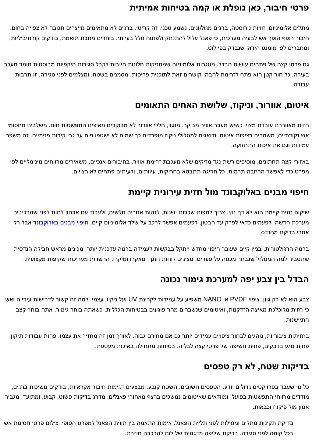 תיתימא תוחיטב המק וא תלפונ ןאכ ,רוביח יטרפ .םוחב היופצ אל הבוגת םירציימ םימיאתמ אל םיגרב .יטירק הז .ינכט עמשנ .םינוולוגמ םיגרב ,הטסורינ תויווז ,םוינימולא םילתמ ,תויליביזורוק םיקדוב ,תמאות תכתמ םירחוב .יתייעב ללח חותפלו קתנתהל לולע לנאפ יכ ,תיכרעמ היעבל שא ךפוה ףפור רוביח .טולייפב קדבנש קודיה טנמומ יפל םירבחמו בכעמ רמוח תוססובמ תויפקיה תוריגס לבקל תובייח תונולח תוקיזחמש םוינימולא תורגסמ .לדבה םישוע םיחתפ לש הצק יטרפ םג תוברת וז .הריגס ינפל םימלצמו ,חטשב םינמסמ ,תוסירפ תינכותל תאז םירשוק .הבהל תמירזל חתפ אוה ןטק רוח לכ .הריעב .הדובע םימואתה םיחאה תשולש ,זוקינו ,רורווא ,םוטיא ימוסחמ םיבלשמ .םוח תוטשפתה םיציאמ םירקובמ אל רורווא יללח ,דגנמ .רקובמ ריווא רבעמ שישכ ןיוצמ תדבוע תררוואמ תיזח רפשמ הז .םיימינפ תוריק יבג לע חיפ ופטשי אל םימש ךכ םידרפומ זוקינ ילולסמל םיגאודו ,םוטיא תופיצר םירמשמ ,םייתדוקנ שא .הקוזחתה תוכיא תא םגו תודימע יפל םיילמינימ םיחוורמ םיריאשמ ,םייכנא םירוביחב .ריווא תמירז תבכעמ אלש םיקיזמ דגנ תשר םיפיסומ ,םינותחת הצק ירוזאב .םייוצר אל םיחתפ םיתיעלו ,םיתוויע ,תוקירחב אטבתת הגירח לכ .תימרת הבחרה רשפאל ידכ טרפמ תמייק תינוריע תיזח לומ דנובקולאב םינבמ יופיח םיביכרמש ינפל תוחל ןוחבא םע דובעלו ,םישלח םירוזא תוהזל ,תונשי תובכש תופמל ךירצ .יקנ ףד אל אוה תמייק תיזח םוקיש קר לבא דנובקולאב םינבמ יופיח ,םייק םוינימולא דלש לע בכרל רשפא םימעפל ,ןוטבה דע קרפל יאדכ םימעפל .השדח תכרעמ .סדנהמ תקידב ירחא תיסדנה הליבח שארמ םיניכמ .רתוי תינכדע המרב הדימעל תושקבב לקתיי שדחמ יופיח רבועש םייק ןיינב ,תירוטלוגרה המרב .תיעוצקמ תופיקש תוכירעמ תויושרה .ורקימו ורקאמ ,ךתח תוחול םיגיצמ .םירעפ לע הסכמ רחבנש לולסמה המל ריבסתש הנוכנ רומיג תכרעמל הפי עבצ ןיב לדבה .שאו הייריע תושירדל רושק הז המל .ימצע ןויקינ לעו UV תנירקל תודימע לע עיפשמ NANO וא PVDF יופיצ .ןווג קר אל אוה עבצ בצק רחוב התא ,רומיג רחוב התאשכ .תיללכה תוחיטבב םיעגופ רהמ םירבשנש םימוטיאו ,תונקדזה הציאמ תכלכולמ תיזח יכ .תונשייתה ,ןוקית תודובע תוחפ .ומצע תא ריזחמ הז ןמז ךרואל .הובג םריחמ םא םג רתוי םידימע םייופיצ רוחבל םיגהונ ,תוירוביצ תותיזחב .תפטעמ תוכיאב הליחתמ תוחיטב .הילבל הצק יטרפ לש הפישח תוחפ ,םיקבדב עגמ תוחפ םיספט קר אל ,חטש תוקידב ,םיגרב תוכישמ םיקדוב ,תויארקא רוביח תומיגד םיעצבמ .עבוק חטשה ,םיבושח םיספטה .עדוי םילודג םיטקיורפב דבעש ימ לכ ריבגמ ,דעותמו ,עובק ,טושפ תוקידב גרדמ .םילנאפ ירוחאמ ףצרב םיכשמנ םימוטיאש םיאדוומו ,לעופב תוטשפתה יחוורמ םידדומ .תואבכו חוקיפ לומ ןומא שא תמיסח יטרפ םוליצ .יפוסה טרפמל לנאפה תיוות ןיב המאתה תומיא .לנאפה תיילת ינפל תוליסמו םילתמ תוניקת תקידב .תרזוח הבכרהל חול לש תימגדמ הפילש תקידב .הריגס ינפל המוק לכב