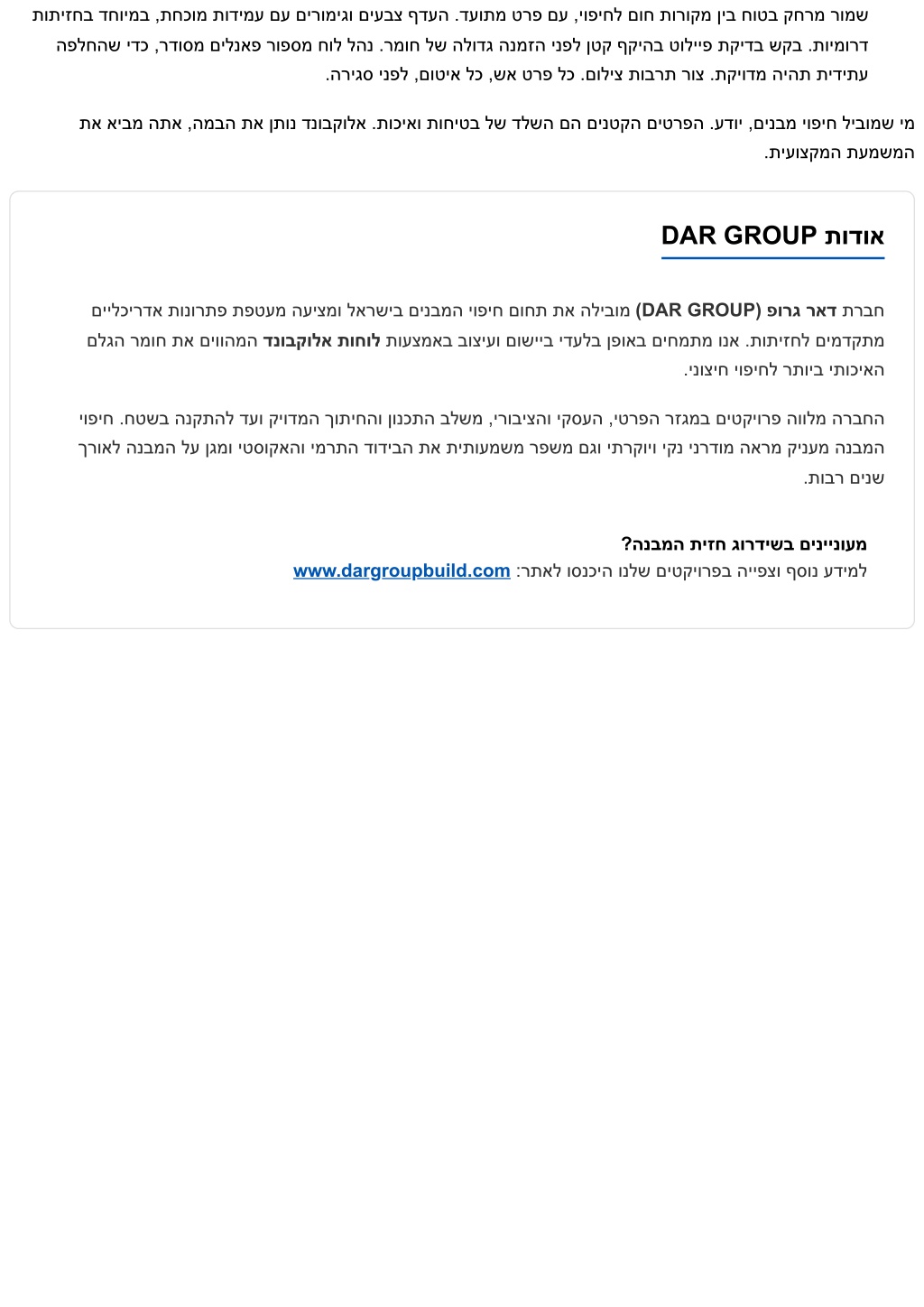 תותיזחב דחוימב ,תחכומ תודימע םע םירומיגו םיעבצ ףדעה .דעותמ טרפ םע ,יופיחל םוח תורוקמ ןיב חוטב קחרמ רומש הפלחהש ידכ ,רדוסמ םילנאפ רופסמ חול להנ .רמוח לש הלודג הנמזה ינפל ןטק ףקיהב טולייפ תקידב שקב .תוימורד .הריגס ינפל ,םוטיא לכ ,שא טרפ לכ .םוליצ תוברת רוצ .תקיודמ היהת תידיתע תא איבמ התא ,המבה תא ןתונ דנובקולא .תוכיאו תוחיטב לש דלשה םה םינטקה םיטרפה .עדוי ,םינבמ יופיח ליבומש ימ .תיעוצקמה תעמשמה DAR GROUP תודוא םיילכירדא תונורתפ תפטעמ העיצמו לארשיב םינבמה יופיח םוחת תא הליבומ (DAR GROUP) פורג ראד תרבח םלגה רמוח תא םיווהמה דנובקולא תוחול תועצמאב בוציעו םושייב ידעלב ןפואב םיחמתמ ונא .תותיזחל םימדקתמ .ינוציח יופיחל רתויב יתוכיאה יופיח .חטשב הנקתהל דעו קיודמה ךותיחהו ןונכתה בלשמ ,ירוביצהו יקסעה ,יטרפה רזגמב םיטקיורפ הוולמ הרבחה ךרואל הנבמה לע ןגמו יטסוקאהו ימרתה דודיבה תא תיתועמשמ רפשמ םגו יתרקויו יקנ ינרדומ הארמ קינעמ הנבמה .תובר םינש ?הנבמה תיזח גורדישב םיניינועמ www.dargroupbuild.com :רתאל וסנכיה ונלש םיטקיורפב הייפצו ףסונ עדימל
