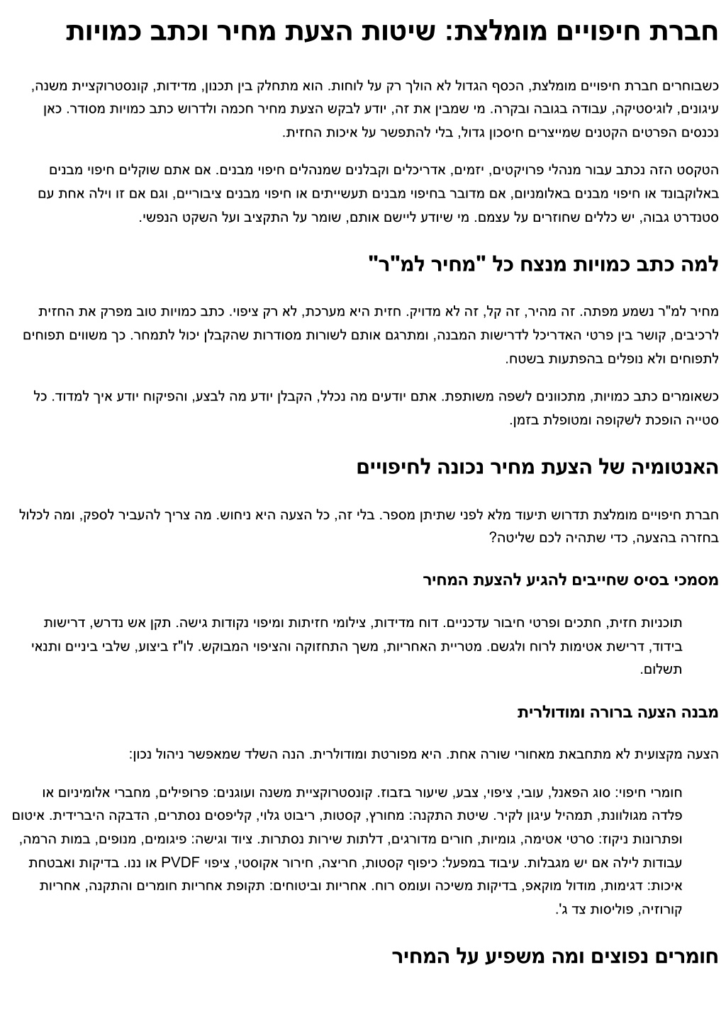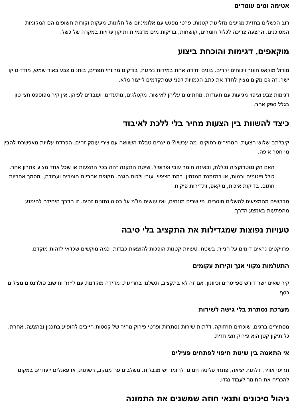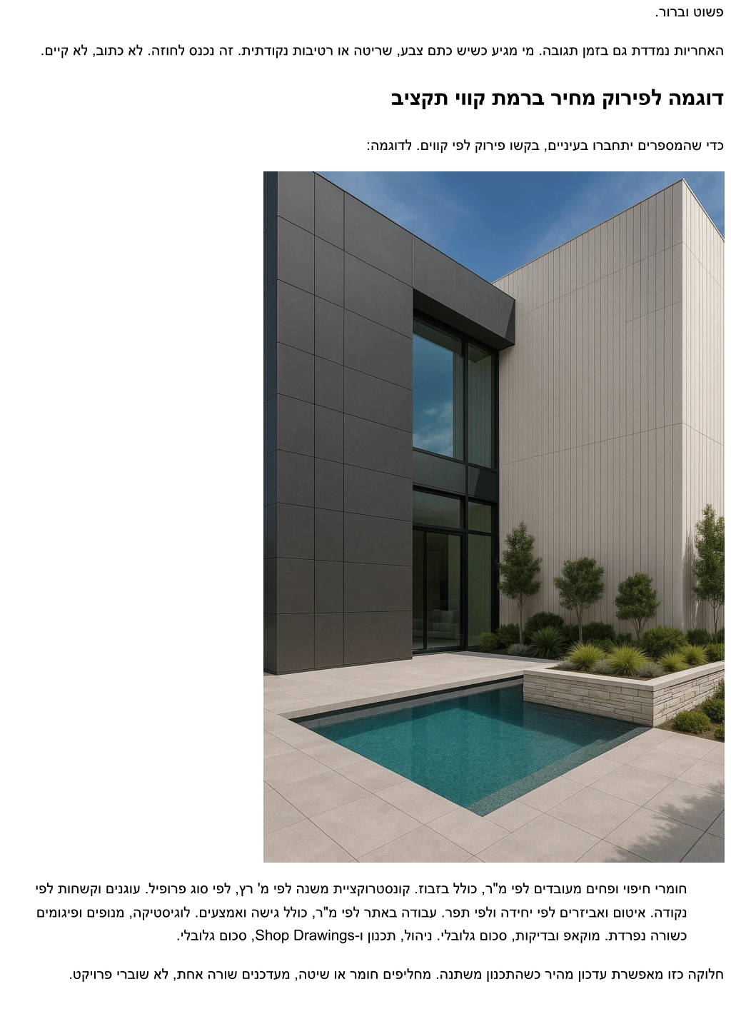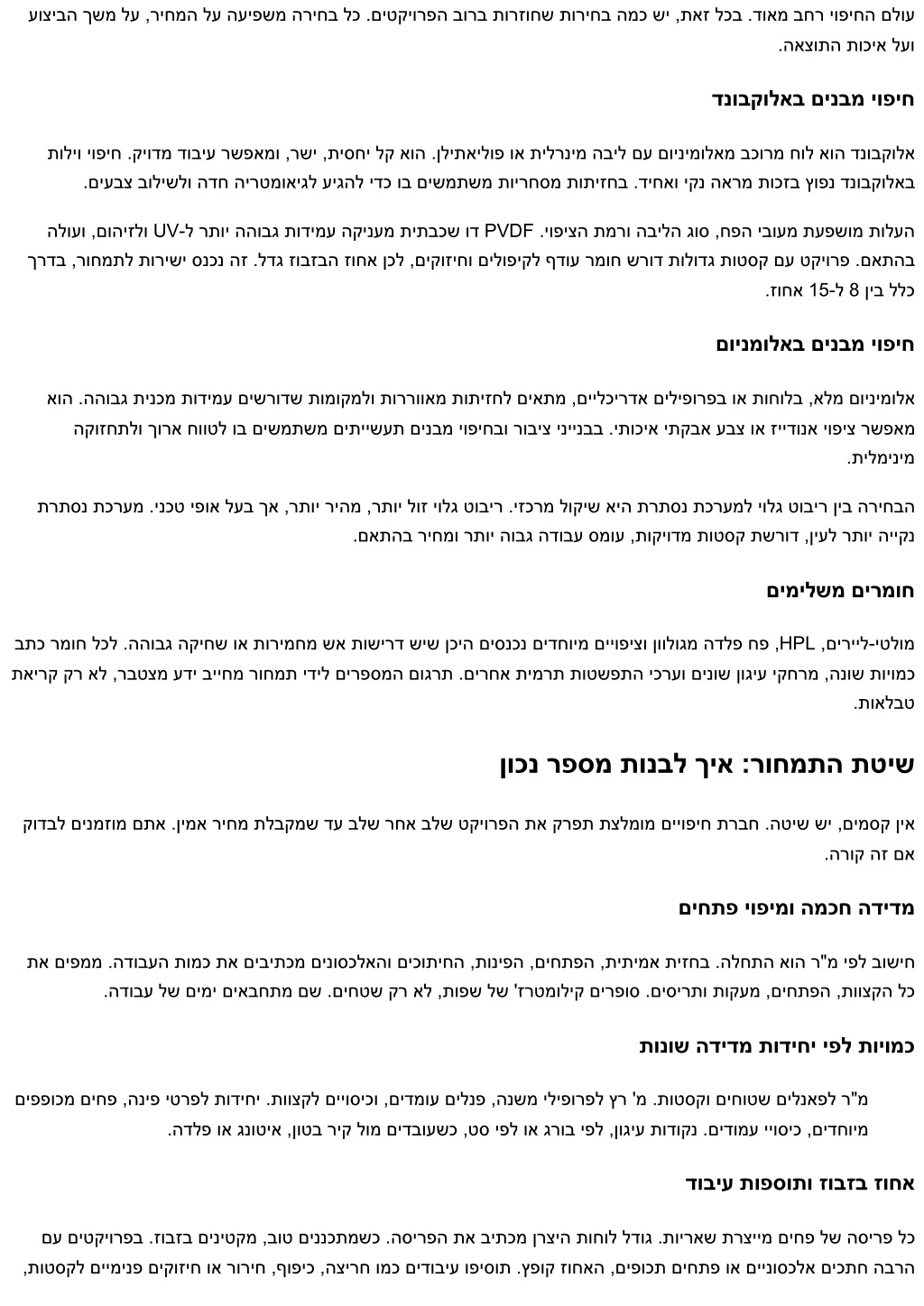 תויומכ בתכו ריחמ תעצה תוטיש :תצלמומ םייופיח תרבח ,הנשמ תייצקורטסנוק ,תודידמ ,ןונכת ןיב קלחתמ אוה .תוחול לע קר ךלוה אל לודגה ףסכה ,תצלמומ םייופיח תרבח םירחובשכ ןאכ .רדוסמ תויומכ בתכ שורדלו המכח ריחמ תעצה שקבל עדוי ,הז תא ןיבמש ימ .הרקבו הבוגב הדובע ,הקיטסיגול ,םינוגיע .תיזחה תוכיא לע רשפתהל ילב ,לודג ןוכסיח םירציימש םינטקה םיטרפה םיסנכנ םינבמ יופיח םילקוש םתא םא .םינבמ יופיח םילהנמש םינלבקו םילכירדא ,םימזי ,םיטקיורפ ילהנמ רובע בתכנ הזה טסקטה םע תחא הליו וז םא םגו ,םיירוביצ םינבמ יופיח וא םיתיישעת םינבמ יופיחב רבודמ םא ,םוינמולאב םינבמ יופיח וא דנובקולאב .ישפנה טקשה לעו ביצקתה לע רמוש ,םתוא םשייל עדויש ימ .םמצע לע םירזוחש םיללכ שי ,הובג טרדנטס "ר"מל ריחמ" לכ חצנמ תויומכ בתכ המל תיזחה תא קרפמ בוט תויומכ בתכ .יופיצ קר אל ,תכרעמ איה תיזח .קיודמ אל הז ,לק הז ,ריהמ הז .התפמ עמשנ ר"מל ריחמ םיחופת םיוושמ ךכ .רחמתל לוכי ןלבקהש תורדוסמ תורושל םתוא םגרתמו ,הנבמה תושירדל לכירדאה יטרפ ןיב רשוק ,םיביכרל .חטשב תועתפהב םילפונ אלו םיחופתל לכ .דודמל ךיא עדוי חוקיפהו ,עצבל המ עדוי ןלבקה ,ללכנ המ םיעדוי םתא .תפתושמ הפשל םינווכתמ ,תויומכ בתכ םירמואשכ .ןמזב תלפוטמו הפוקשל תכפוה הייטס םייופיחל הנוכנ ריחמ תעצה לש הימוטנאה לולכל המו ,קפסל ריבעהל ךירצ המ .שוחינ איה העצה לכ ,הז ילב .רפסמ ןתיתש ינפל אלמ דועית שורדת תצלמומ םייופיח תרבח ?הטילש םכל היהתש ידכ ,העצהב הרזחב ריחמה תעצהל עיגהל םיבייחש סיסב יכמסמ תושירד ,שרדנ שא ןקת .השיג תודוקנ יופימו תותיזח ימוליצ ,תודידמ חוד .םיינכדע רוביח יטרפו םיכתח ,תיזח תוינכות יאנתו םייניב יבלש ,עוציב ז"ול .שקובמה יופיצהו הקוזחתה ךשמ ,תוירחאה תיירטמ .םשגלו חורל תומיטא תשירד ,דודיב .םולשת תירלודומו הרורב העצה הנבמ :ןוכנ לוהינ רשפאמש דלשה הנה .תירלודומו תטרופמ איה .תחא הרוש ירוחאמ תאבחתמ אל תיעוצקמ העצה וא םוינימולא ירבחמ ,םיליפורפ :םינגועו הנשמ תייצקורטסנוק .זובזב רועיש ,עבצ ,יופיצ ,יבוע ,לנאפה גוס :יופיח ירמוח םוטיא .תידירביה הקבדה ,םירתסנ םיספילק ,יולג טוביר ,תוטסק ,ץרוחמ :הנקתה תטיש .ריקל ןוגיע ליהמת ,תנוולוגמ הדלפ ,המרה תומב ,םיפונמ ,םימוגיפ :השיגו דויצ .תורתסנ תוריש תותלד ,םיגרודמ םירוח ,תוימוג ,המיטא יטרס :זוקינ תונורתפו תחטבאו תוקידב .וננ וא PVDF יופיצ ,יטסוקא רוריח ,הצירח ,תוטסק ףופיכ :לעפמב דוביע .תולבגמ שי םא הליל תודובע תוירחא ,הנקתהו םירמוח תוירחא תפוקת :םיחוטיבו תוירחא .חור סמועו הכישמ תוקידב ,פאקומ לודומ ,תומיגד :תוכיא .'ג דצ תוסילופ ,היזורוק ריחמה לע עיפשמ המו םיצופנ םירמוח