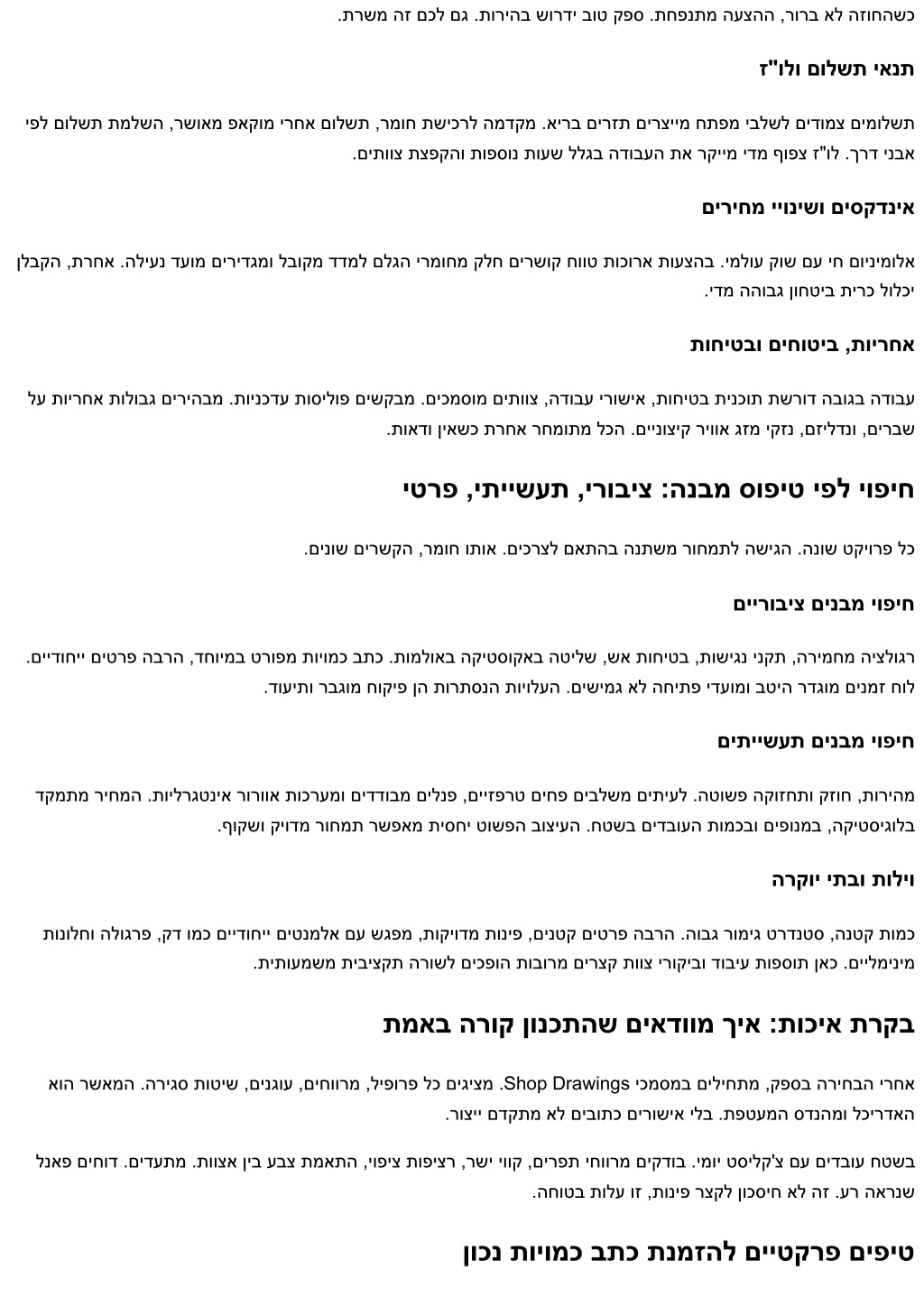 .תרשמ הז םכל םג .תוריהב שורדי בוט קפס .תחפנתמ העצהה ,רורב אל הזוחהשכ ז"ולו םולשת יאנת יפל םולשת תמלשה ,רשואמ פאקומ ירחא םולשת ,רמוח תשיכרל המדקמ .אירב םירזת םירציימ חתפמ יבלשל םידומצ םימולשת .םיתווצ תצפקהו תופסונ תועש ללגב הדובעה תא רקיימ ידמ ףופצ ז"ול .ךרד ינבא םיריחמ ייונישו םיסקדניא ןלבקה ,תרחא .הליענ דעומ םירידגמו לבוקמ דדמל םלגה ירמוחמ קלח םירשוק חווט תוכורא תועצהב .ימלוע קוש םע יח םוינימולא .ידמ ההובג ןוחטיב תירכ לולכי תוחיטבו םיחוטיב ,תוירחא לע תוירחא תולובג םיריהבמ .תוינכדע תוסילופ םישקבמ .םיכמסומ םיתווצ ,הדובע ירושיא ,תוחיטב תינכות תשרוד הבוגב הדובע .תואדו ןיאשכ תרחא רחמותמ לכה .םיינוציק ריווא גזמ יקזנ ,םזילדנו ,םירבש יטרפ ,יתיישעת ,ירוביצ :הנבמ סופיט יפל יופיח .םינוש םירשקה ,רמוח ותוא .םיכרצל םאתהב הנתשמ רוחמתל השיגה .הנוש טקיורפ לכ םיירוביצ םינבמ יופיח .םיידוחיי םיטרפ הברה ,דחוימב טרופמ תויומכ בתכ .תומלואב הקיטסוקאב הטילש ,שא תוחיטב ,תושיגנ ינקת ,הרימחמ היצלוגר .דועיתו רבגומ חוקיפ ןה תורתסנה תויולעה .םישימג אל החיתפ ידעומו בטיה רדגומ םינמז חול םיתיישעת םינבמ יופיח דקמתמ ריחמה .תוילרגטניא רורווא תוכרעמו םידדובמ םילנפ ,םייזפרט םיחפ םיבלשמ םיתיעל .הטושפ הקוזחתו קזוח ,תוריהמ .ףוקשו קיודמ רוחמת רשפאמ תיסחי טושפה בוציעה .חטשב םידבועה תומכבו םיפונמב ,הקיטסיגולב הרקוי יתבו תוליו תונולחו הלוגרפ ,קד ומכ םיידוחיי םיטנמלא םע שגפמ ,תוקיודמ תוניפ ,םינטק םיטרפ הברה .הובג רומיג טרדנטס ,הנטק תומכ .תיתועמשמ תיביצקת הרושל םיכפוה תובורמ םירצק תווצ ירוקיבו דוביע תופסות ןאכ .םיילמינימ תמאב הרוק ןונכתהש םיאדוומ ךיא :תוכיא תרקב אוה רשאמה .הריגס תוטיש ,םינגוע ,םיחוורמ ,ליפורפ לכ םיגיצמ .Shop Drawings יכמסמב םיליחתמ ,קפסב הריחבה ירחא .רוציי םדקתמ אל םיבותכ םירושיא ילב .תפטעמה סדנהמו לכירדאה לנאפ םיחוד .םידעתמ .תווצא ןיב עבצ תמאתה ,יופיצ תופיצר ,רשי יווק ,םירפת יחוורמ םיקדוב .ימוי טסילק'צ םע םידבוע חטשב .החוטב תולע וז ,תוניפ רצקל ןוכסיח אל הז .ער הארנש ןוכנ תויומכ בתכ תנמזהל םייטקרפ םיפיט