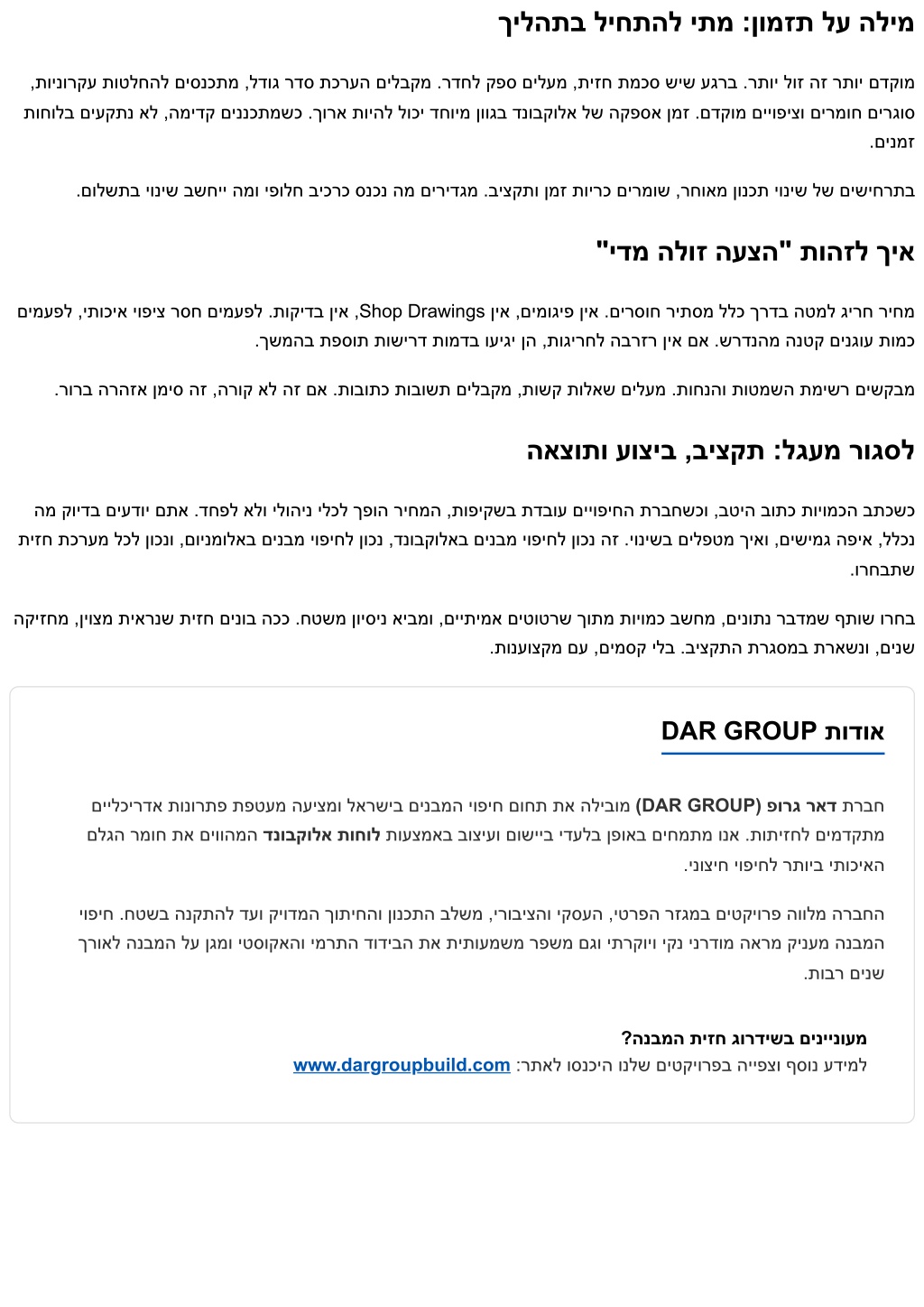 ךילהתב ליחתהל יתמ :ןומזת לע הלימ ,תוינורקע תוטלחהל םיסנכתמ ,לדוג רדס תכרעה םילבקמ .רדחל קפס םילעמ ,תיזח תמכס שיש עגרב .רתוי לוז הז רתוי םדקומ תוחולב םיעקתנ אל ,המידק םיננכתמשכ .ךורא תויהל לוכי דחוימ ןווגב דנובקולא לש הקפסא ןמז .םדקומ םייופיצו םירמוח םירגוס .םינמז .םולשתב יוניש בשחיי המו יפולח ביכרכ סנכנ המ םירידגמ .ביצקתו ןמז תוירכ םירמוש ,רחואמ ןונכת יוניש לש םישיחרתב "ידמ הלוז העצה" תוהזל ךיא םימעפל ,יתוכיא יופיצ רסח םימעפל .תוקידב ןיא ,Shop Drawings ןיא ,םימוגיפ ןיא .םירסוח ריתסמ ללכ ךרדב הטמל גירח ריחמ .ךשמהב תפסות תושירד תומדב ועיגי ןה ,תוגירחל הברזר ןיא םא .שרדנהמ הנטק םינגוע תומכ .רורב הרהזא ןמיס הז ,הרוק אל הז םא .תובותכ תובושת םילבקמ ,תושק תולאש םילעמ .תוחנהו תוטמשה תמישר םישקבמ האצותו עוציב ,ביצקת :לגעמ רוגסל המ קוידב םיעדוי םתא .דחפל אלו ילוהינ ילכל ךפוה ריחמה ,תופיקשב תדבוע םייופיחה תרבחשכו ,בטיה בותכ תויומכה בתכשכ תיזח תכרעמ לכל ןוכנו ,םוינמולאב םינבמ יופיחל ןוכנ ,דנובקולאב םינבמ יופיחל ןוכנ הז .יונישב םילפטמ ךיאו ,םישימג הפיא ,ללכנ .ורחבתש הקיזחמ ,ןיוצמ תיארנש תיזח םינוב הככ .חטשמ ןויסינ איבמו ,םייתימא םיטוטרש ךותמ תויומכ בשחמ ,םינותנ רבדמש ףתוש ורחב .תונעוצקמ םע ,םימסק ילב .ביצקתה תרגסמב תראשנו ,םינש DAR GROUP תודוא םיילכירדא תונורתפ תפטעמ העיצמו לארשיב םינבמה יופיח םוחת תא הליבומ (DAR GROUP) פורג ראד תרבח םלגה רמוח תא םיווהמה דנובקולא תוחול תועצמאב בוציעו םושייב ידעלב ןפואב םיחמתמ ונא .תותיזחל םימדקתמ .ינוציח יופיחל רתויב יתוכיאה יופיח .חטשב הנקתהל דעו קיודמה ךותיחהו ןונכתה בלשמ ,ירוביצהו יקסעה ,יטרפה רזגמב םיטקיורפ הוולמ הרבחה ךרואל הנבמה לע ןגמו יטסוקאהו ימרתה דודיבה תא תיתועמשמ רפשמ םגו יתרקויו יקנ ינרדומ הארמ קינעמ הנבמה .תובר םינש ?הנבמה תיזח גורדישב םיניינועמ www.dargroupbuild.com :רתאל וסנכיה ונלש םיטקיורפב הייפצו ףסונ עדימל