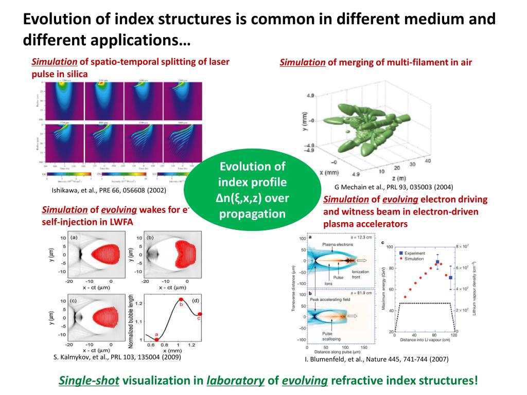 Evolution of index structures is common in different medium and different applications… Simulation of spatio-temporal splitting of laser pulse in silica Simulation of merging of multi-filament in air Simulation of evolving wakes for e- self-injection in LWFA Evolution of index profile Δn(ξ,x,z) over propagation S. Kalmykov, et al., PRL 103, 135004 (2009) G Mechainet al., PRL 93, 035003 (2004) Simulation of evolving electron driving and witness beam in electron-driven plasma accelerators Ishikawa, et al., PRE 66, 056608 (2002) I. Blumenfeld, et al., Nature 445, 741-744 (2007) Single-shot visualization in laboratory of evolving refractive index structures!