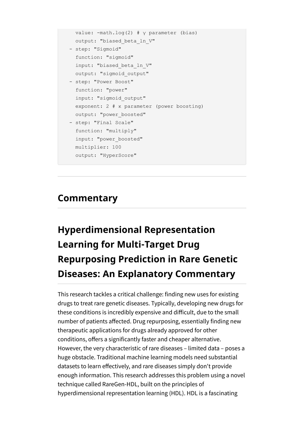 value: -math.log(2) # γ parameter (bias) output: "biased_beta_ln_V" - step: "Sigmoid" function: "sigmoid" input: "biased_beta_ln_V" output: "sigmoid_output" - step: "Power Boost" function: "power" input: "sigmoid_output" exponent: 2 # κ parameter (power boosting) output: "power_boosted" - step: "Final Scale" function: "multiply" input: "power_boosted" multiplier: 100 output: "HyperScore" Commentary Hyperdimensional Representation Learning for Multi-Target Drug Repurposing Prediction in Rare Genetic Diseases: An Explanatory Commentary This research tackles a critical challenge: finding new uses for existing drugs to treat rare genetic diseases. Typically, developing new drugs for these conditions is incredibly expensive and difficult, due to the small number of patients affected. Drug repurposing, essentially finding new therapeutic applications for drugs already approved for other conditions, offers a significantly faster and cheaper alternative. However, the very characteristic of rare diseases – limited data – poses a huge obstacle. Traditional machine learning models need substantial datasets to learn effectively, and rare diseases simply don't provide enough information. This research addresses this problem using a novel technique called RareGen-HDL, built on the principles of hyperdimensional representation learning (HDL). HDL is a fascinating