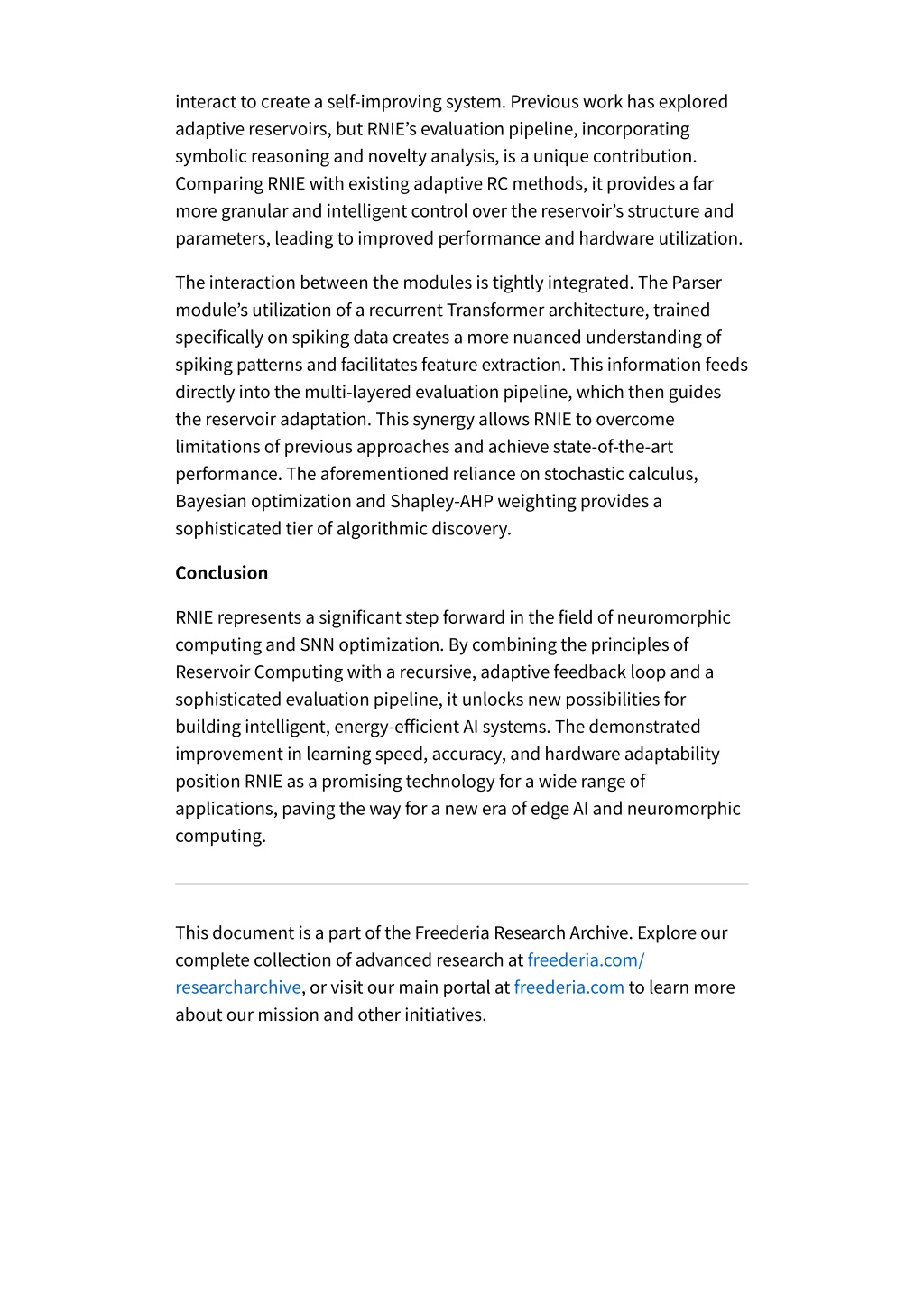 9. interact to create a self-improving system. Previous work has explored adaptive reservoirs, but RNIE’s evaluation pipeline, incorporating symbolic reasoning and novelty analysis, is a unique contribution. Comparing RNIE with existing adaptive RC methods, it provides a far more granular and intelligent control over the reservoir’s structure and parameters, leading to improved performance and hardware utilization. The interaction between the modules is tightly integrated. The Parser module’s utilization of a recurrent Transformer architecture, trained specifically on spiking data creates a more nuanced understanding of spiking patterns and facilitates feature extraction. This information feeds directly into the multi-layered evaluation pipeline, which then guides the reservoir adaptation. This synergy allows RNIE to overcome limitations of previous approaches and achieve state-of-the-art performance. The aforementioned reliance on stochastic calculus, Bayesian optimization and Shapley-AHP weighting provides a sophisticated tier of algorithmic discovery. Conclusion RNIE represents a significant step forward in the field of neuromorphic computing and SNN optimization. By combining the principles of Reservoir Computing with a recursive, adaptive feedback loop and a sophisticated evaluation pipeline, it unlocks new possibilities for building intelligent, energy-efficient AI systems. The demonstrated improvement in learning speed, accuracy, and hardware adaptability position RNIE as a promising technology for a wide range of applications, paving the way for a new era of edge AI and neuromorphic computing. This document is a part of the Freederia Research Archive. Explore our complete collection of advanced research at freederia.com/ researcharchive, or visit our main portal at freederia.com to learn more about our mission and other initiatives.