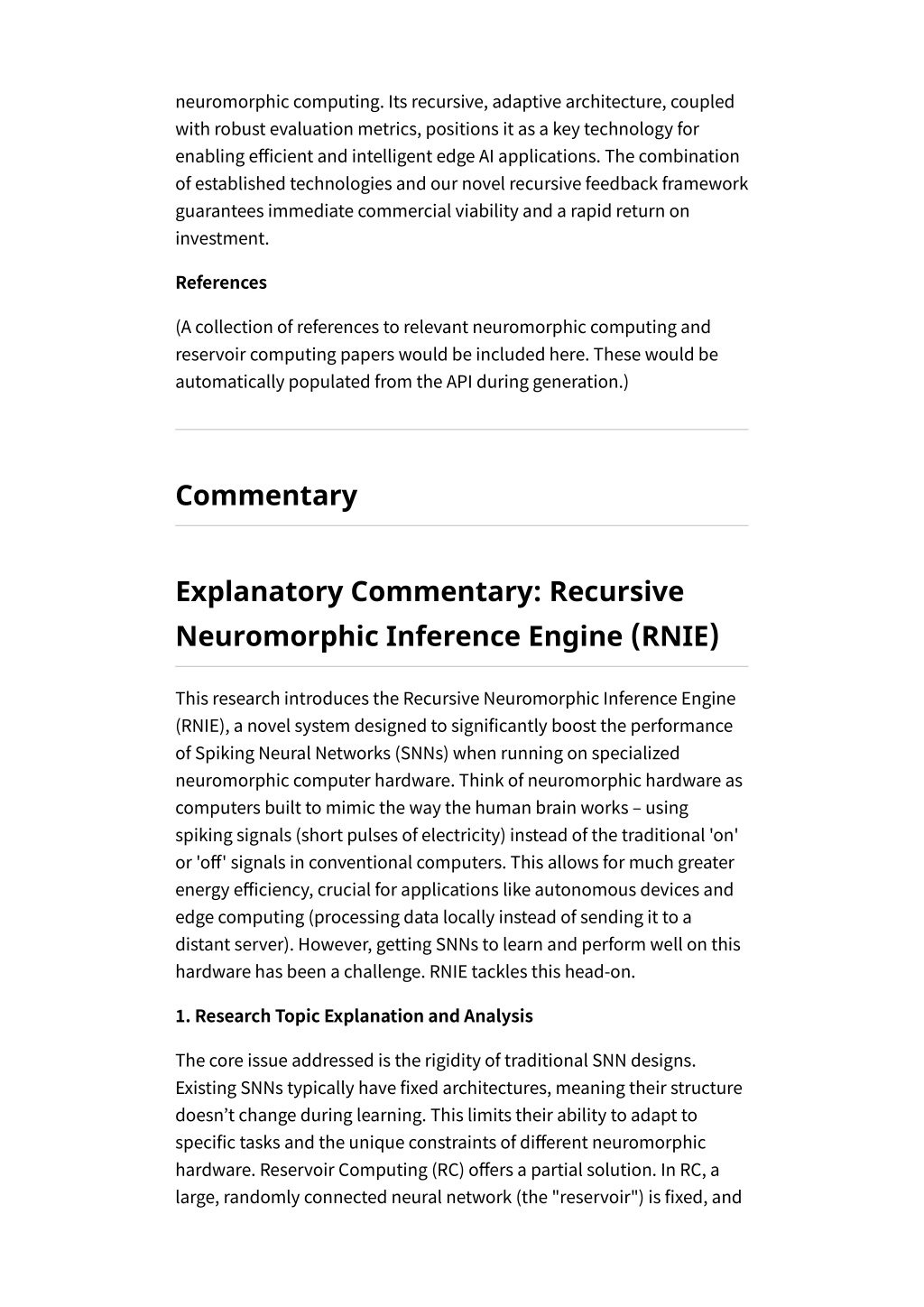 5. neuromorphic computing. Its recursive, adaptive architecture, coupled with robust evaluation metrics, positions it as a key technology for enabling efficient and intelligent edge AI applications. The combination of established technologies and our novel recursive feedback framework guarantees immediate commercial viability and a rapid return on investment. References (A collection of references to relevant neuromorphic computing and reservoir computing papers would be included here. These would be automatically populated from the API during generation.) Commentary Explanatory Commentary: Recursive Neuromorphic Inference Engine (RNIE) This research introduces the Recursive Neuromorphic Inference Engine (RNIE), a novel system designed to significantly boost the performance of Spiking Neural Networks (SNNs) when running on specialized neuromorphic computer hardware. Think of neuromorphic hardware as computers built to mimic the way the human brain works – using spiking signals (short pulses of electricity) instead of the traditional 'on' or 'off' signals in conventional computers. This allows for much greater energy efficiency, crucial for applications like autonomous devices and edge computing (processing data locally instead of sending it to a distant server). However, getting SNNs to learn and perform well on this hardware has been a challenge. RNIE tackles this head-on. 1. Research Topic Explanation and Analysis The core issue addressed is the rigidity of traditional SNN designs. Existing SNNs typically have fixed architectures, meaning their structure doesn’t change during learning. This limits their ability to adapt to specific tasks and the unique constraints of different neuromorphic hardware. Reservoir Computing (RC) offers a partial solution. In RC, a large, randomly connected neural network (the "reservoir") is fixed, and