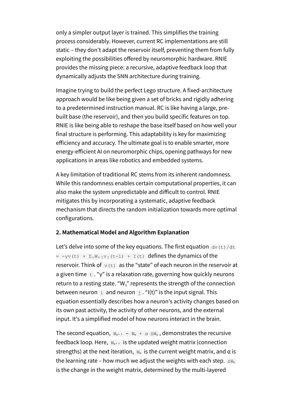 6. only a simpler output layer is trained. This simplifies the training process considerably. However, current RC implementations are still static – they don't adapt the reservoir itself, preventing them from fully exploiting the possibilities offered by neuromorphic hardware. RNIE provides the missing piece: a recursive, adaptive feedback loop that dynamically adjusts the SNN architecture during training. Imagine trying to build the perfect Lego structure. A fixed-architecture approach would be like being given a set of bricks and rigidly adhering to a predetermined instruction manual. RC is like having a large, pre- built base (the reservoir), and then you build specific features on top. RNIE is like being able to reshape the base itself based on how well your final structure is performing. This adaptability is key for maximizing efficiency and accuracy. The ultimate goal is to enable smarter, more energy-efficient AI on neuromorphic chips, opening pathways for new applications in areas like robotics and embedded systems. A key limitation of traditional RC stems from its inherent randomness. While this randomness enables certain computational properties, it can also make the system unpredictable and difficult to control. RNIE mitigates this by incorporating a systematic, adaptive feedback mechanism that directs the random initialization towards more optimal configurations. 2. Mathematical Model and Algorithm Explanation Let’s delve into some of the key equations. The first equation dv(t)/dt = -γv(t) + ΣᵢWᵢⱼvⱼ(t-1) + I(t) defines the dynamics of the reservoir. Think of v(t) as the “state” of each neuron in the reservoir at a given time t . "γ" is a relaxation rate, governing how quickly neurons return to a resting state. “Wᵢⱼ” represents the strength of the connection between neuron i and neuron j . “I(t)” is the input signal. This equation essentially describes how a neuron's activity changes based on its own past activity, the activity of other neurons, and the external input. It's a simplified model of how neurons interact in the brain. The second equation, Wₙ₊₁ = Wₙ + α⋅ΔWₙ , demonstrates the recursive feedback loop. Here, Wₙ₊₁ is the updated weight matrix (connection strengths) at the next iteration, Wₙ is the current weight matrix, and α is the learning rate – how much we adjust the weights with each step. ΔWₙ is the change in the weight matrix, determined by the multi-layered