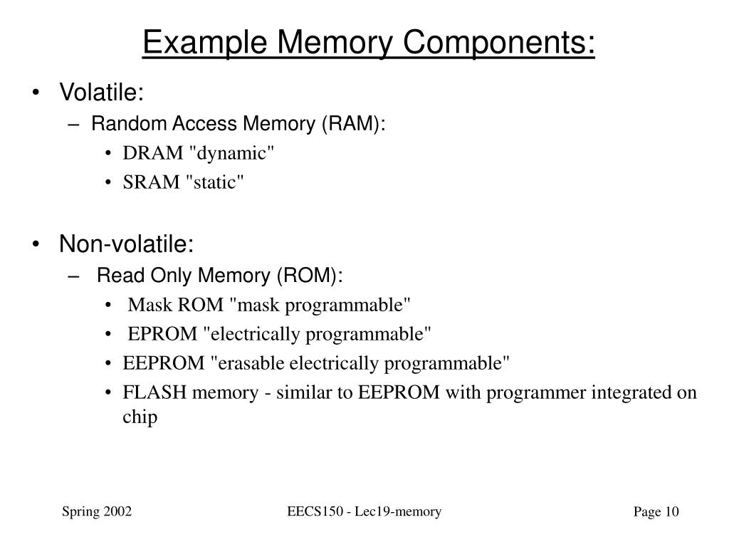 Example Memory Components: • Volatile: • Random Access Memory (RAM): • DRAM "dynamic" • SRAM "static" • Non-volatile: • Read Only Memory (ROM): • Mask ROM "mask programmable" • EPROM "electrically programmable" • EEPROM "erasable electrically programmable" • FLASH memory - similar to EEPROM with programmer integrated on chip EECS150 - Lec19-memory