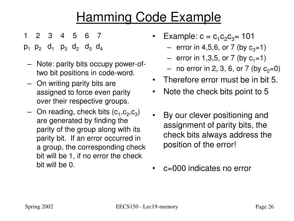 Example: c = c1c2c3= 101 error in 4,5,6, or 7 (by c3=1) error in 1,3,5, or 7 (by c1=1) no error in 2, 3, 6, or 7 (by c2=0) Therefore error must be in bit 5. Note the check bits point to 5 By our clever positioning and assignment of parity bits, the check bits always address the position of the error! c=000 indicates no error 1 2 3 4 5 6 7 p1 p2 d1 p3 d2 d3 d4 Note: parity bits occupy power-of-two bit positions in code-word. On writing parity bits are assigned to force even parity over their respective groups. On reading, check bits (c1,c2,c3) are generated by finding the parity of the group along with its parity bit. If an error occurred in a group, the corresponding check bit will be 1, if no error the check bit will be 0. Hamming Code Example EECS150 - Lec19-memory