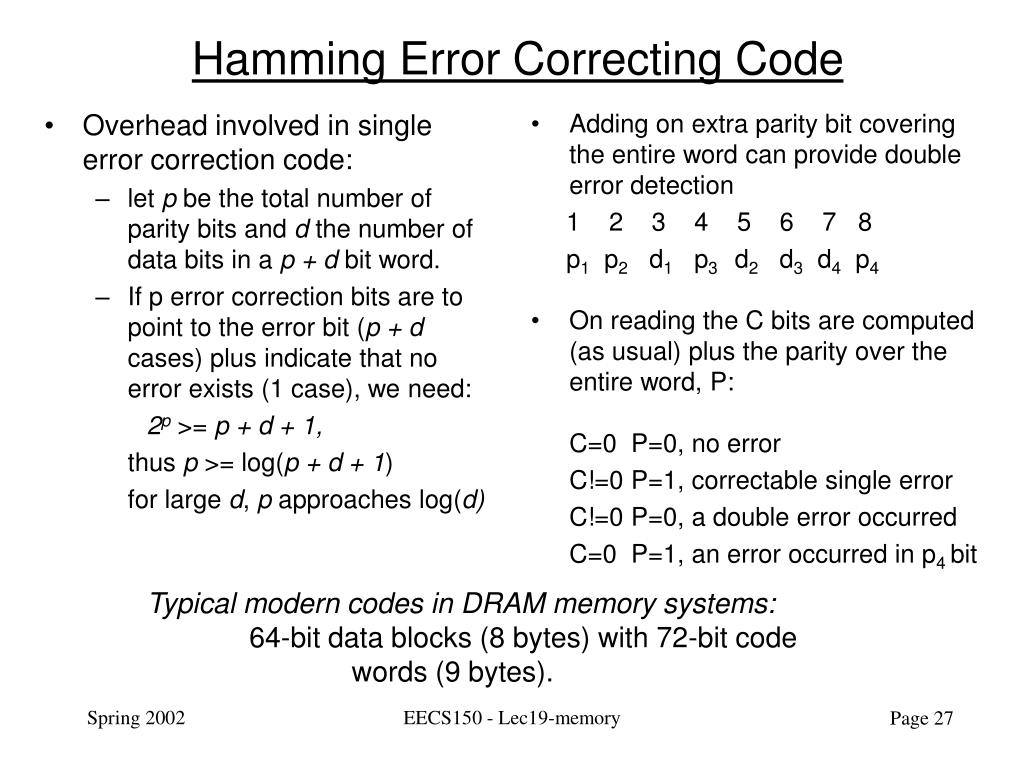 Overhead involved in single error correction code: let p be the total number of parity bits and d the number of data bits in a p + d bit word. If p error correction bits are to point to the error bit (p + d cases) plus indicate that no error exists (1 case), we need: 2p >= p + d + 1, thus p >= log(p + d + 1) for large d, p approaches log(d) Adding on extra parity bit covering the entire word can provide double error detection 1 2 3 4 5 6 7 8 p1 p2 d1 p3 d2 d3 d4 p4 On reading the C bits are computed (as usual) plus the parity over the entire word, P: C=0 P=0, no error C!=0 P=1, correctable single error C!=0 P=0, a double error occurred C=0 P=1, an error occurred in p4 bit Hamming Error Correcting Code Typical modern codes in DRAM memory systems: 64-bit data blocks (8 bytes) with 72-bit code words (9 bytes). EECS150 - Lec19-memory