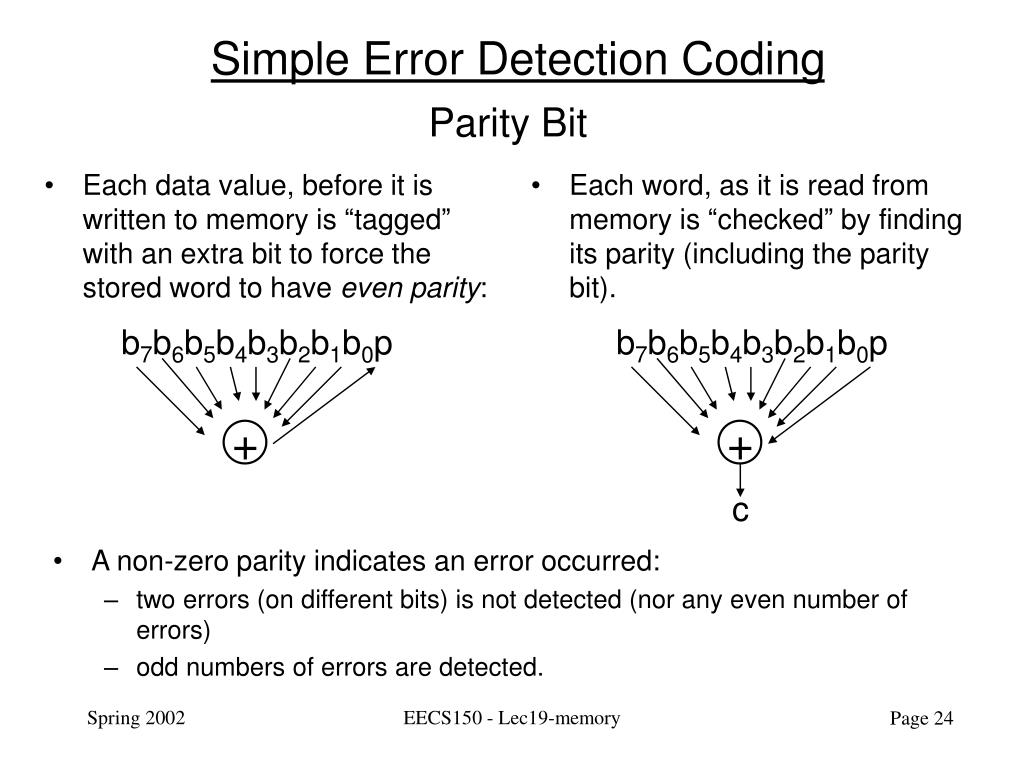Each data value, before it is written to memory is “tagged” with an extra bit to force the stored word to have even parity: Each word, as it is read from memory is “checked” by finding its parity (including the parity bit). b7b6b5b4b3b2b1b0p b7b6b5b4b3b2b1b0p + + c Simple Error Detection Coding Parity Bit • A non-zero parity indicates an error occurred: • two errors (on different bits) is not detected (nor any even number of errors) • odd numbers of errors are detected. EECS150 - Lec19-memory