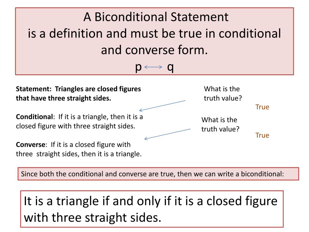A Biconditional Statementis a definition and must be true in conditional and converse form.p q Statement: Triangles are closed figures that have three straight sides. Conditional: If it is a triangle, then it is a closed figure with three straight sides. Converse: If it is a closed figure with three straight sides, then it is a triangle. What is the truth value? True What is the truth value? True Since both the conditional and converse are true, then we can write a biconditional: It is a triangle if and only if it is a closed figure with three straight sides.
