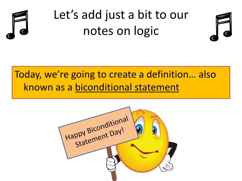 Let’s add just a bit to our notes on logic Today, we’re going to create a definition… also known as a biconditional statement Happy Biconditional Statement Day!