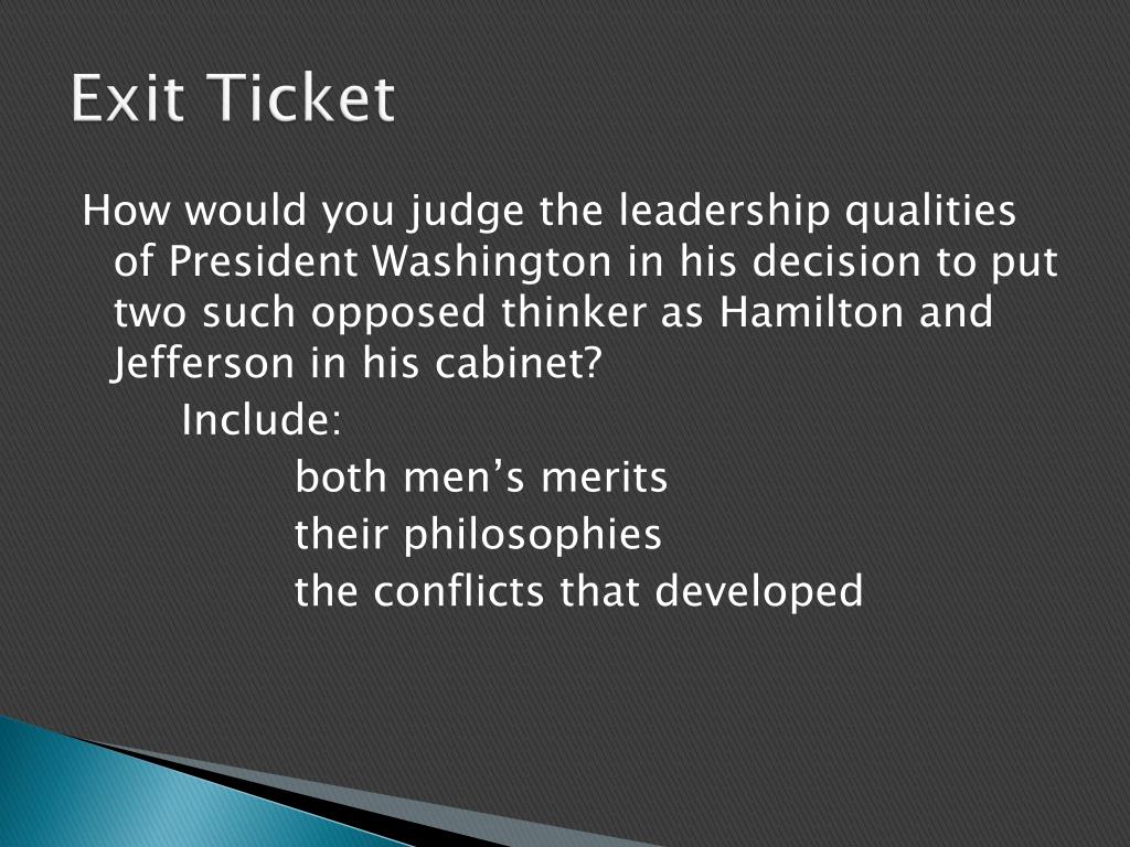 Exit Ticket How would you judge the leadership qualities of President Washington in his decision to put two such opposed thinker as Hamilton and Jefferson in his cabinet? Include: both men’s merits their philosophies the conflicts that developed