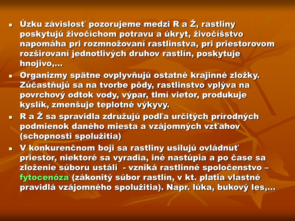 Úzku závislosť pozorujeme medzi R a Ž, rastliny poskytujú živočíchom potravu a úkryt, živočíšstvo napomáha pri rozmnožovaní rastlinstva, pri priestorovom rozširovaní jednotlivých druhov rastlín, poskytuje hnojivo,... • Organizmy spätne ovplyvňujú ostatné krajinné zložky. Zúčastňujú sa na tvorbe pôdy, rastlinstvo vplýva na povrchový odtok vody, výpar, tlmí vietor, produkuje kyslík, zmenšuje teplotné výkyvy. • R a Ž sa spravidla združujú podľa určitých prírodných podmienok daného miesta a vzájomných vzťahov (schopnosti spolužitia) • V konkurenčnom boji sa rastliny usilujú ovládnuť priestor, niektoré sa vyradia, iné nastúpia a po čase sa zloženie súboru ustáli - vzniká rastlinné spoločenstvo – fytocenóza (zákonitý súbor rastlín, v kt. platia vlastnépravidlá vzájomného spolužitia). Napr. lúka, bukový les,...