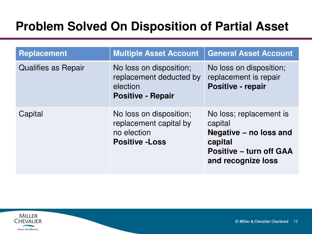 2011 Temporary Regulations Disposition Rules • Multiple Asset Accounts (Commonly Used) • Expanded definition of disposition • Required recognition of loss • Basis goes away so there is no more depreciation • Loss (whether taken or not) triggers capitalization of replacement • General Asset Accounts • No loss recognized • Depreciation continues • Replacement as repair or capital under general rules • Flexibility to turn off GAA treatment to recognize loss.