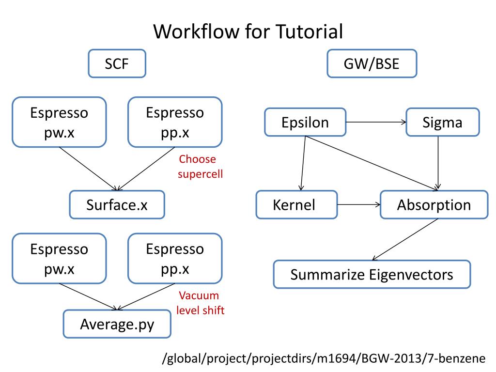 Workflow for Tutorial SCF GW/BSE Espresso pw.x Espresso pp.x Epsilon Sigma Choose supercell Surface.x Kernel Absorption Espresso pw.x Espresso pp.x Summarize Eigenvectors Vacuum level shift Average.py /global/project/projectdirs/m1694/BGW-2013/7-benzene