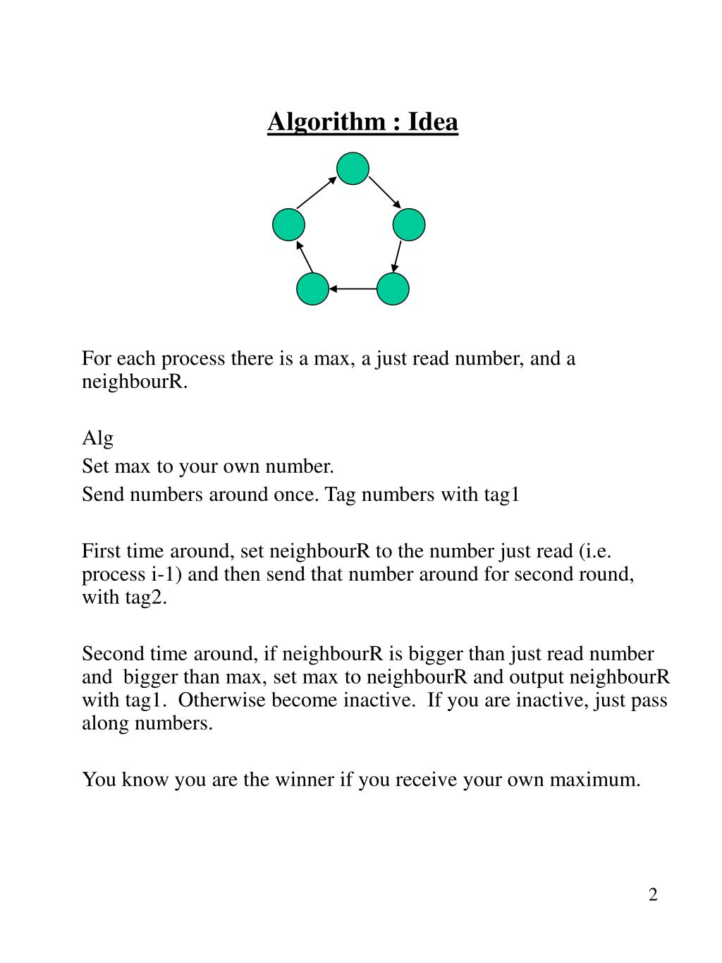 Algorithm : Idea For each process there is a max, a just read number, and a neighbourR. Alg Set max to your own number. Send numbers around once. Tag numbers with tag1 First time around, set neighbourR to the number just read (i.e. process i-1) and then send that number around for second round, with tag2. Second time around, if neighbourR is bigger than just read number and bigger than max, set max to neighbourR and output neighbourR with tag1. Otherwise become inactive. If you are inactive, just pass along numbers. You know you are the winner if you receive your own maximum.