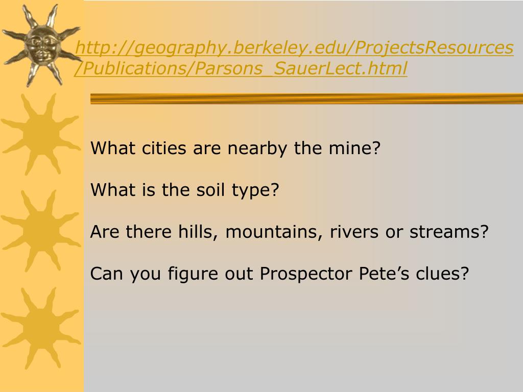 http://geography.berkeley.edu/ProjectsResources/Publications/Parsons_SauerLect.htmlhttp://geography.berkeley.edu/ProjectsResources/Publications/Parsons_SauerLect.html What cities are nearby the mine? What is the soil type? Are there hills, mountains, rivers or streams? Can you figure out Prospector Pete’s clues?