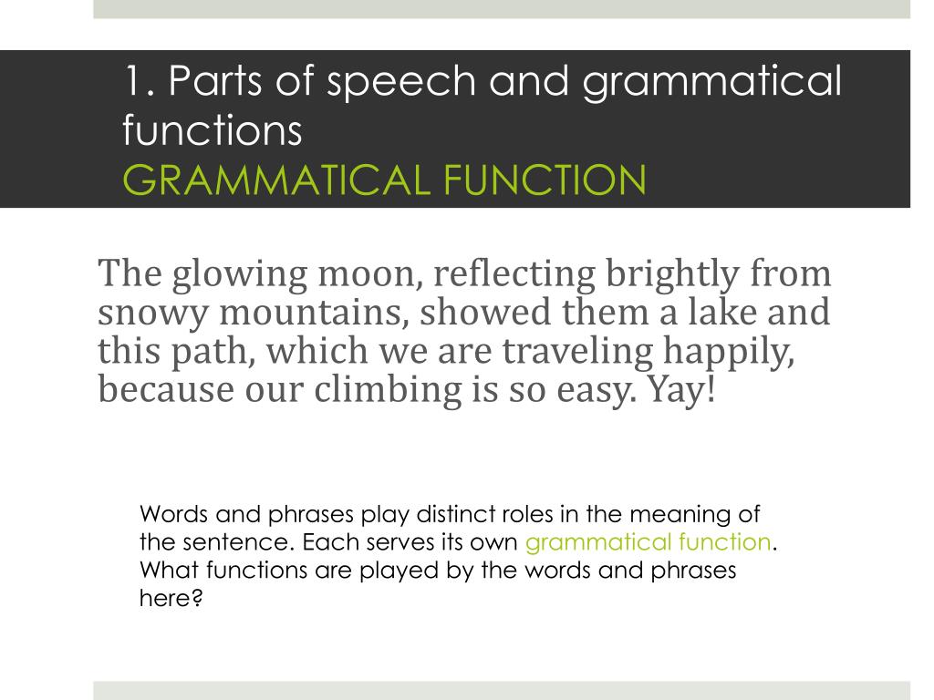 1. Parts of speech and grammatical functionsGRAMMATICAL FUNCTION The glowing moon, reflecting brightly from snowy mountains, showed them a lake and this path, which we are traveling happily, because our climbing is so easy. Yay! Words and phrases play distinct roles in the meaning of the sentence. Each serves its own grammatical function. What functions are played by the words and phrases here?