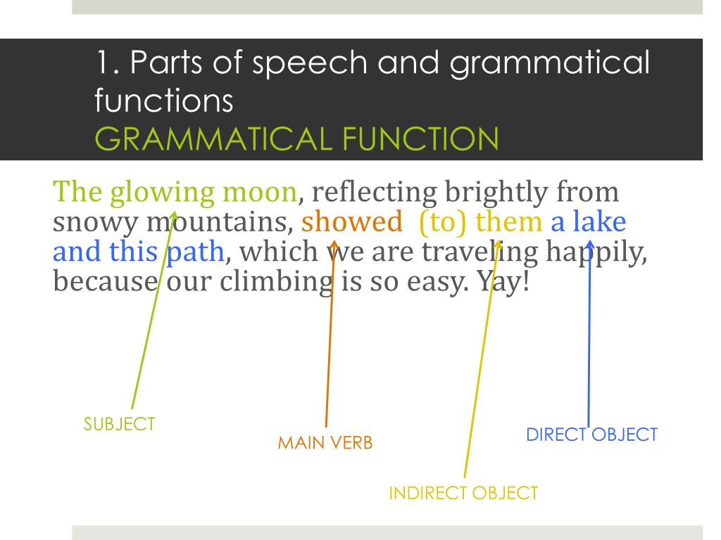 1. Parts of speech and grammatical functionsGRAMMATICAL FUNCTION The glowing moon, reflecting brightly from snowy mountains, showed(to) them a lake and this path, which we are traveling happily, because our climbing is so easy. Yay! SUBJECT DIRECT OBJECT MAIN VERB INDIRECT OBJECT