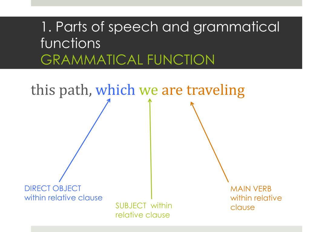 1. Parts of speech and grammatical functionsGRAMMATICAL FUNCTION this path, whichweare traveling DIRECT OBJECT within relative clause MAIN VERB within relative clause SUBJECT within relative clause