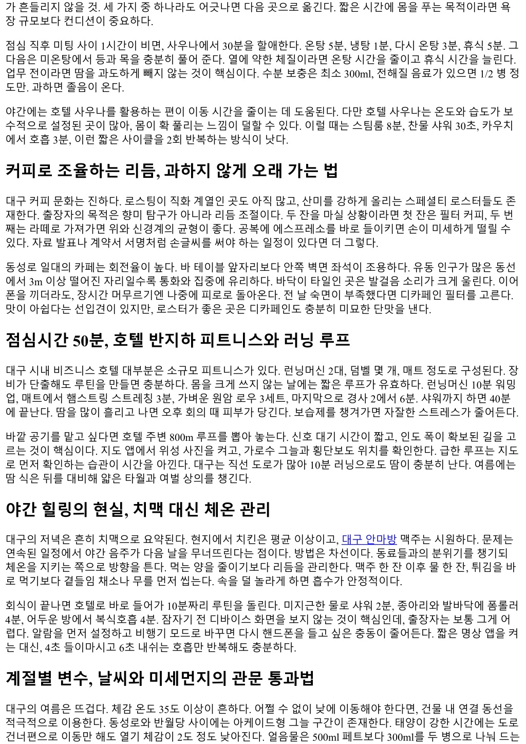 가흔들리지않을것. 세가지중하나라도어긋나면다음곳으로옮긴다. 짧은시간에몸을푸는목적이라면욕 장규모보다컨디션이중요하다. 점심직후미팅사이 1시간이비면, 사우나에서 30분을할애한다. 온탕 5분, 냉탕 1분, 다시온탕 3분, 휴식 5분. 그 다음은미온탕에서등과목을충분히풀어준다. 열에약한체질이라면온탕시간을줄이고휴식시간을늘린다. 업무전이라면땀을과도하게빼지않는것이핵심이다. 수분보충은최소 300ml, 전해질음료가있으면 1/2 병정 도만. 과하면졸음이온다. 야간에는호텔사우나를활용하는편이이동시간을줄이는데도움된다. 다만호텔사우나는온도와습도가보 수적으로설정된곳이많아, 몸이확풀리는느낌이덜할수있다. 이럴때는스팀룸 8분, 찬물샤워 30초, 카우치 에서호흡 3분, 이런짧은사이클을 2회반복하는방식이낫다. 커피로조율하는리듬, 과하지않게오래가는법 대구커피문화는진하다. 로스팅이직화계열인곳도아직많고, 산미를강하게올리는스페셜티로스터들도존 재한다. 출장자의목적은향미탐구가아니라리듬조절이다. 두잔을마실상황이라면첫잔은필터커피, 두번 째는라떼로가져가면위와신경계의균형이좋다. 공복에에스프레소를바로들이키면손이미세하게떨릴수 있다. 자료발표나계약서서명처럼손글씨를써야하는일정이있다면더그렇다. 동성로일대의카페는회전율이높다. 바테이블앞자리보다안쪽벽면좌석이조용하다. 유동인구가많은동선 에서 3m 이상떨어진자리일수록통화와집중에유리하다. 바닥이타일인곳은발걸음소리가크게울린다. 이어 폰을끼더라도, 장시간머무르기엔나중에피로로돌아온다. 전날숙면이부족했다면디카페인필터를고른다. 맛이아쉽다는선입견이있지만, 로스터가좋은곳은디카페인도충분히미묘한단맛을낸다. 점심시간 50분, 호텔반지하피트니스와러닝루프 대구시내비즈니스호텔대부분은소규모피트니스가있다. 런닝머신 2대, 덤벨몇개, 매트정도로구성된다. 장 비가단출해도루틴을만들면충분하다. 몸을크게쓰지않는날에는짧은루프가유효하다. 런닝머신 10분워밍 업, 매트에서햄스트링스트레칭 3분, 가벼운원암로우 3세트, 마지막으로경사 2에서 6분. 샤워까지하면 40분 에끝난다. 땀을많이흘리고나면오후회의때피부가당긴다. 보습제를챙겨가면자잘한스트레스가줄어든다. 바깥공기를맡고싶다면호텔주변 800m 루프를뽑아놓는다. 신호대기시간이짧고, 인도폭이확보된길을고 르는것이핵심이다. 지도앱에서위성사진을켜고, 가로수그늘과횡단보도위치를확인한다. 급한루프는지도 로먼저확인하는습관이시간을아낀다. 대구는직선도로가많아 10분러닝으로도땀이충분히난다. 여름에는 땀식은뒤를대비해얇은타월과여벌상의를챙긴다. 야간힐링의현실, 치맥대신체온관리 대구의저녁은흔히치맥으로요약된다. 현지에서치킨은평균이상이고, 대구안마방맥주는시원하다. 문제는 연속된일정에서야간음주가다음날을무너뜨린다는점이다. 방법은차선이다. 동료들과의분위기를챙기되 체온을지키는쪽으로방향을튼다. 먹는양을줄이기보다리듬을관리한다. 맥주한잔이후물한잔, 튀김을바 로먹기보다곁들임채소나무를먼저씹는다. 속을덜놀라게하면흡수가안정적이다. 회식이끝나면호텔로바로들어가 10분짜리루틴을돌린다. 미지근한물로샤워 2분, 종아리와발바닥에폼롤러 4분, 어두운방에서복식호흡 4분. 잠자기전디바이스화면을보지않는것이핵심인데, 출장자는보통그게어 렵다. 알람을먼저설정하고비행기모드로바꾸면다시핸드폰을들고싶은충동이줄어든다. 짧은명상앱을켜 는대신, 4초들이마시고 6초내쉬는호흡만반복해도충분하다. 계절별변수, 날씨와미세먼지의관문통과법 대구의여름은뜨겁다. 체감온도 35도이상이흔하다. 어쩔수없이낮에이동해야한다면, 건물내연결동선을 적극적으로이용한다. 동성로와반월당사이에는아케이드형그늘구간이존재한다. 태양이강한시간에는도로 건너편으로이동만해도열기체감이 2도정도낮아진다. 얼음물은 500ml 페트보다 300ml를두병으로나눠드는